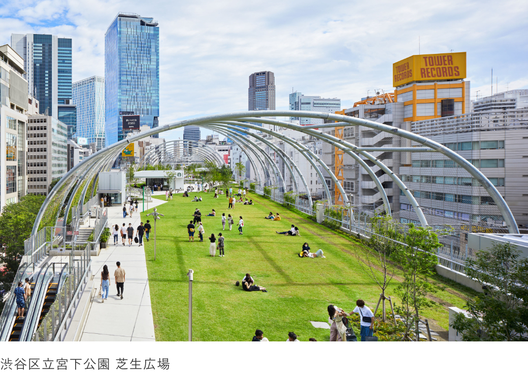 MIYASHITA PARKは、渋谷と原宿の間を立体的につなげる街路状の建築を創出して都市公園を再生させています。新たな立体街路は、これまでの空白地帯を、路面店や屋上公園、変化に富んだ回遊空間、情報発信拠点へと変貌させました。光と緑に溢れた全長330mの屋上公園には、スケートボードやボルダリングなど渋谷らしいスポーツを楽しめる施設やカフェ、芝生の広場があり、さまざまな世代の人々に新しい体験や憩いの場を提供しています。