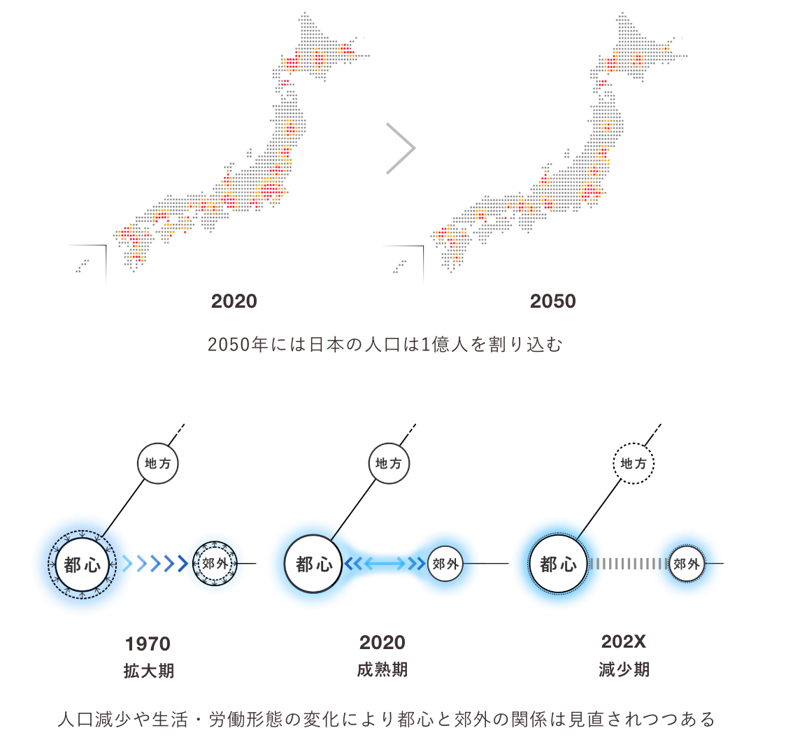 日本の人口は2050年にも1億人を割り込むといわれており、人口減少や少子高齢化がより顕著になりつつある。2020年に発生したコロナ禍の影響もあり、生活・労働形態の変化から都心から1時間ほどの「郊外」の価値が見直されつつある。