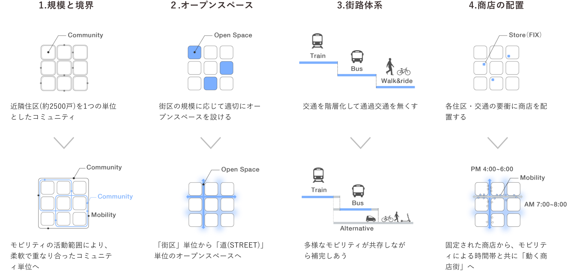 戦後に開発された郊外のニュータウンは開発から50年以上経つものも多く、C.A.ペリーの「近隣住区論」の原則を多く取り入れている。開発当時とはコミュニティや公共空間の考え方が変わりつつある中、モビリティのもつ可能性と共に近隣住区論をより柔軟にアップデートする。
