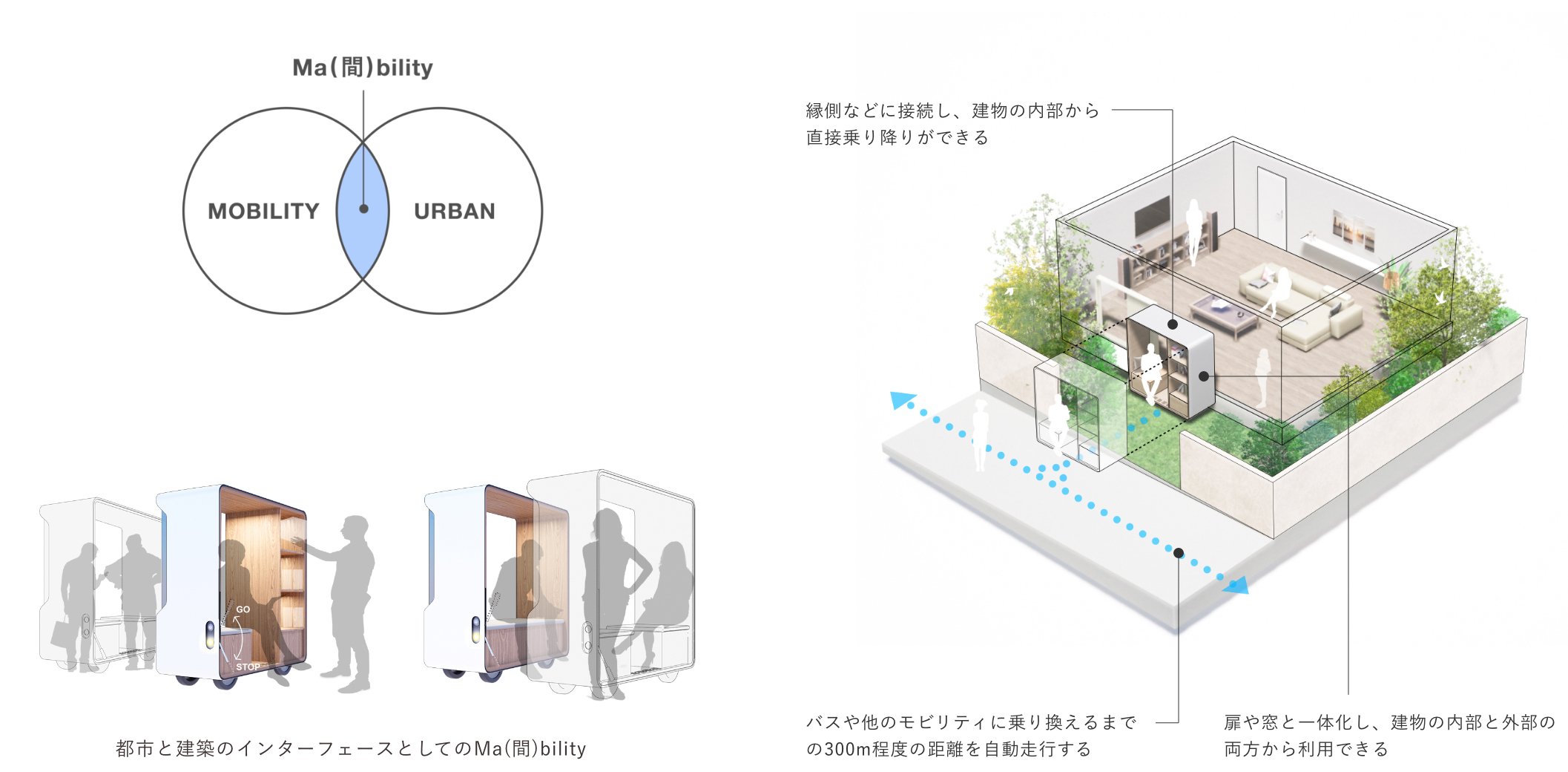 単なる移動手段としてのMobilityから様々な情報や機能、さらにはコミュニケーションの担い手として都市と建築の「インターフェース」としてのMa(間)bilityを提案する。住宅や建物、道の一部となるように規格設計される事で家具や窓のように生活に溶け込むモビリティの姿。