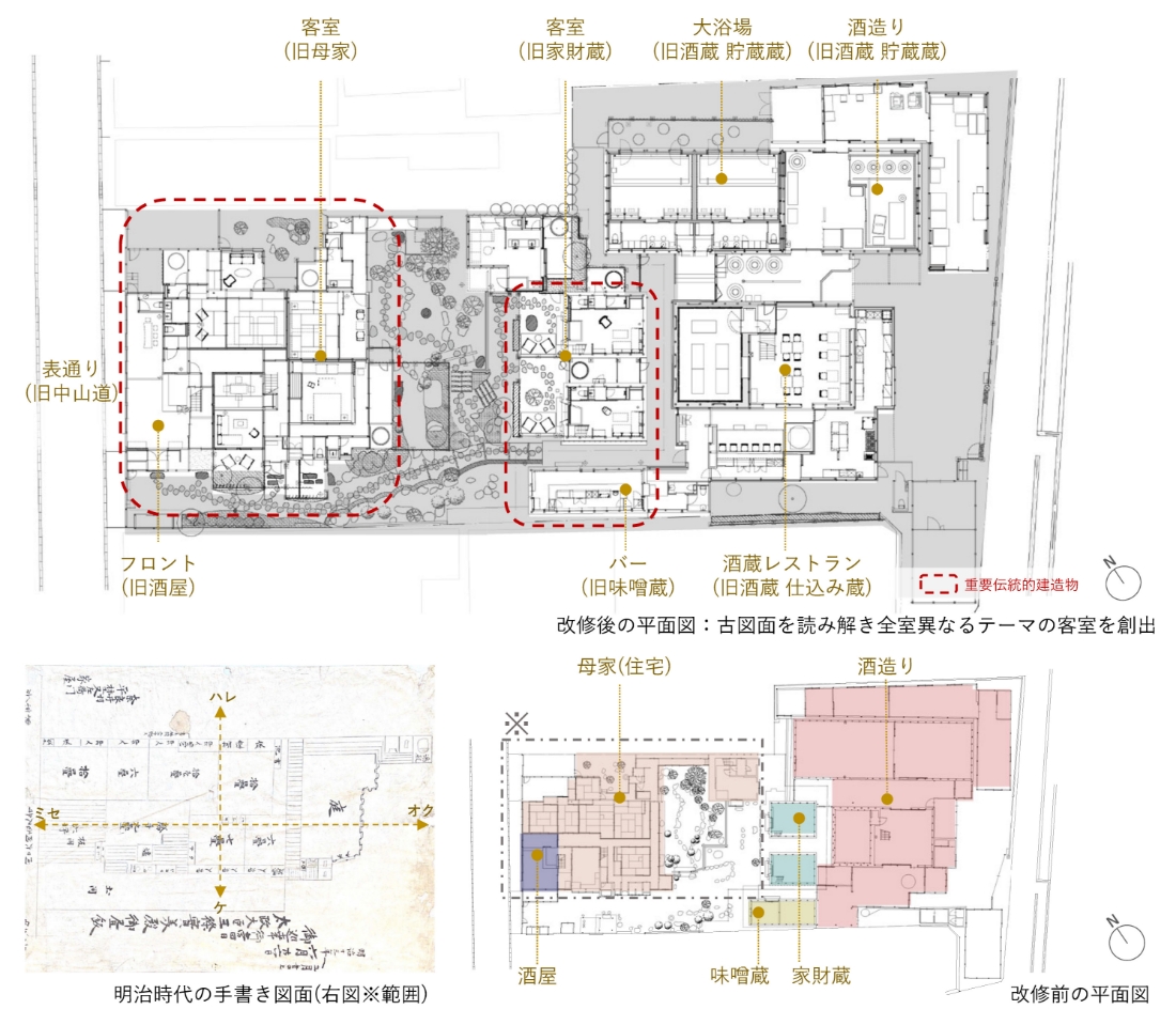 ⽊曽路・奈良井宿にある築200年のかつての造り酒屋「杉の森酒造」を、宿・レストラン・浴場・酒造りエリアを