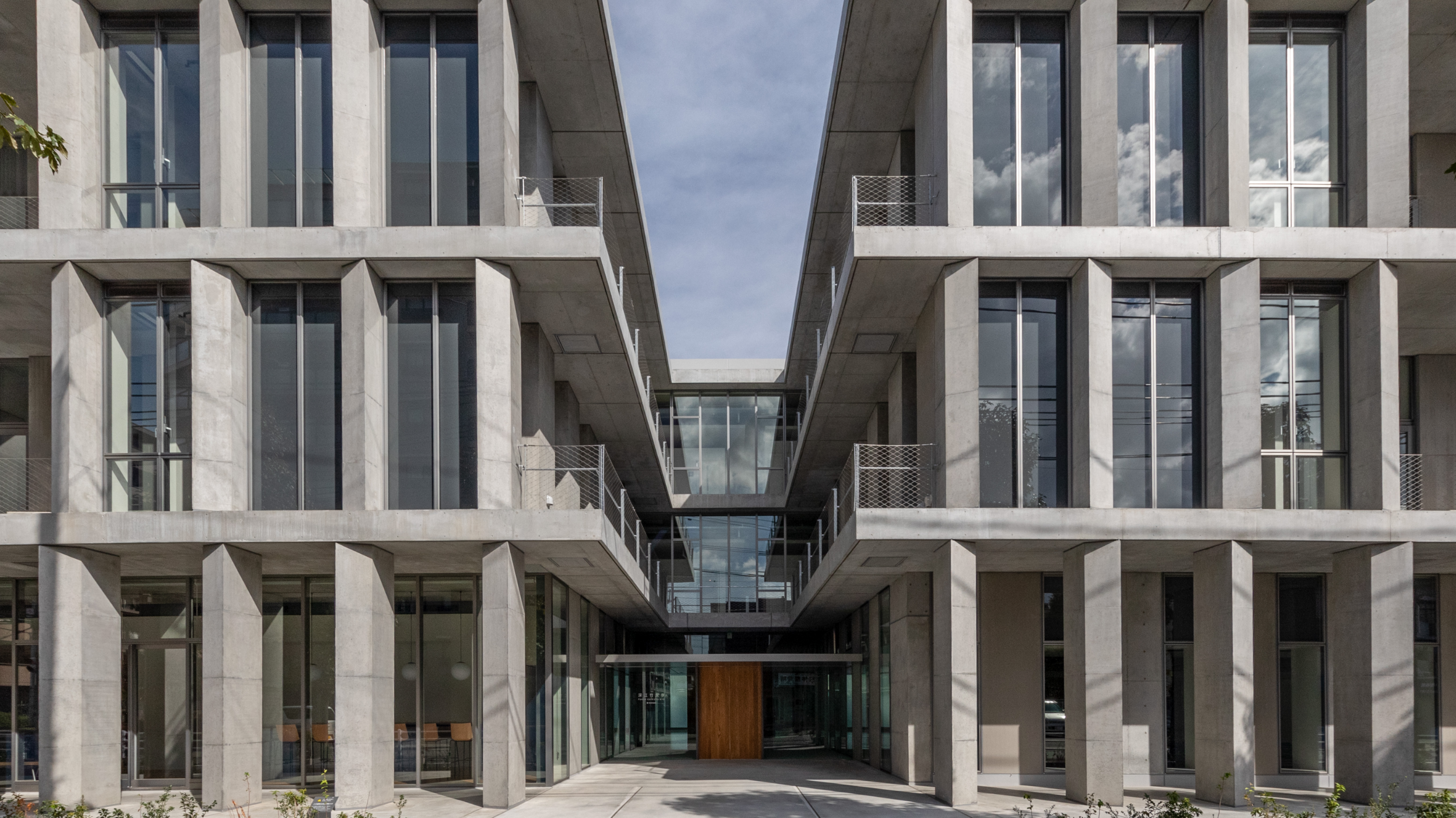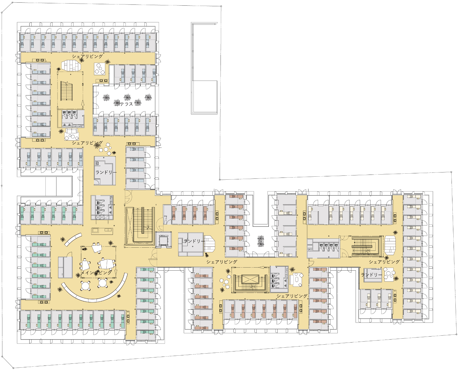 竹中工務店新入社員が1年間共同生活をする教育寮の建て替え計画。新しい寮では女性従業員の増加や時代のニーズにより、旧寮の伝統である相部屋(ふたり1室の共同部屋)を「個室にすること」と、今後の社会変化に柔軟に対応できる人材を育成する「相互研鑽の場」となることが求められた。これに対し、外周部に寮室を配置し建物中央に設えた共用部(リビング)を寮生全員でシェアする構成とした。寮生同士が互いの領域を共有し合うことで、豊かな共感性と新しい未来へ繋がる想像力が育まれる場となることを期待している。