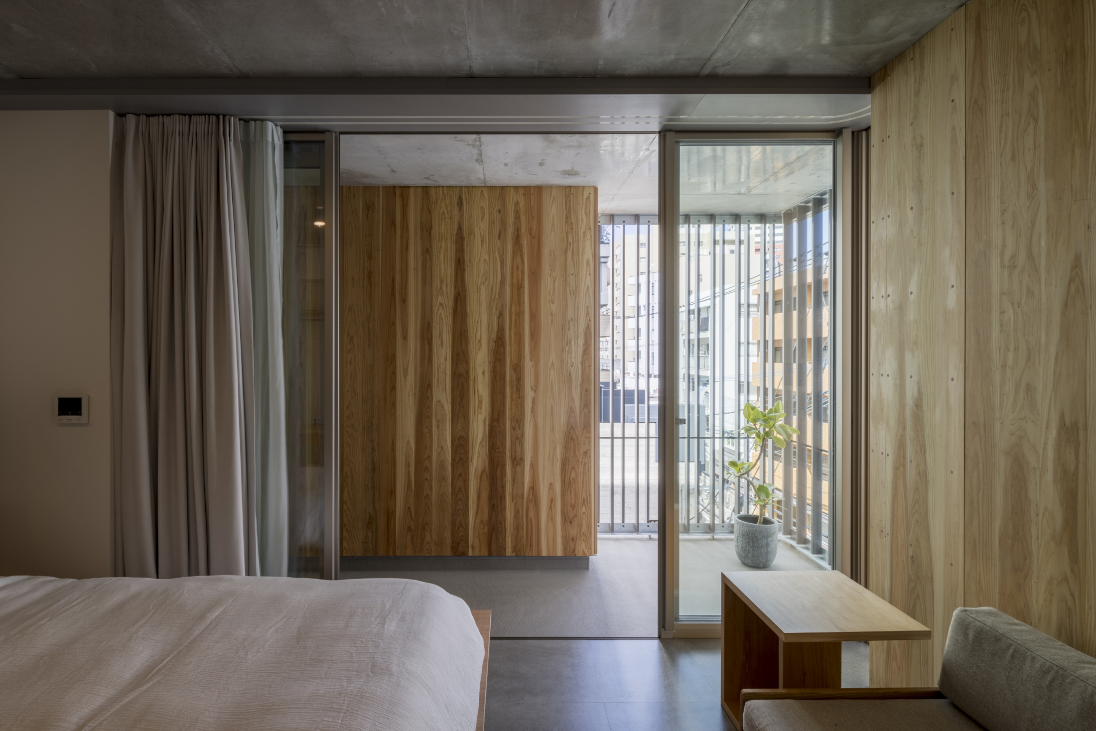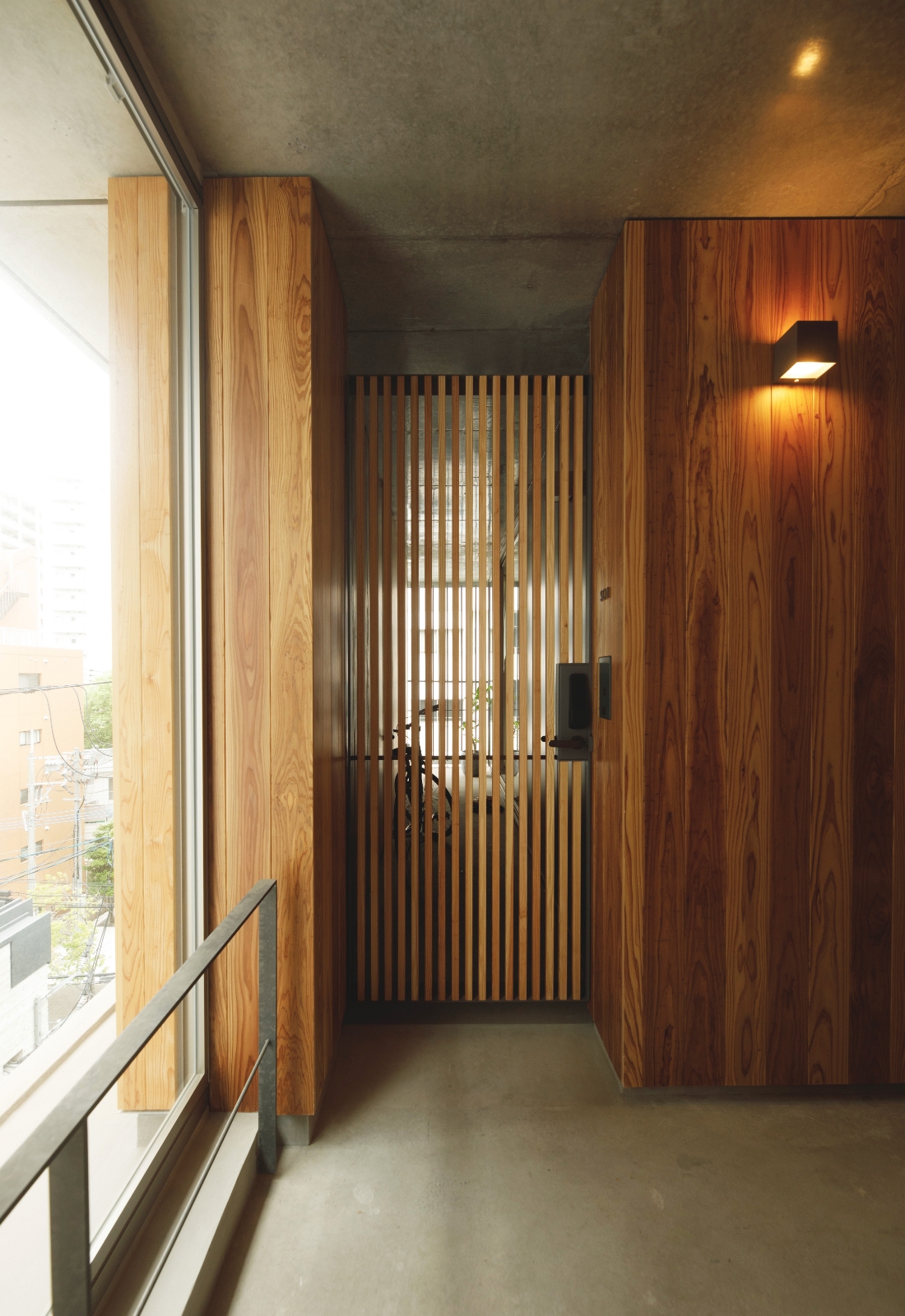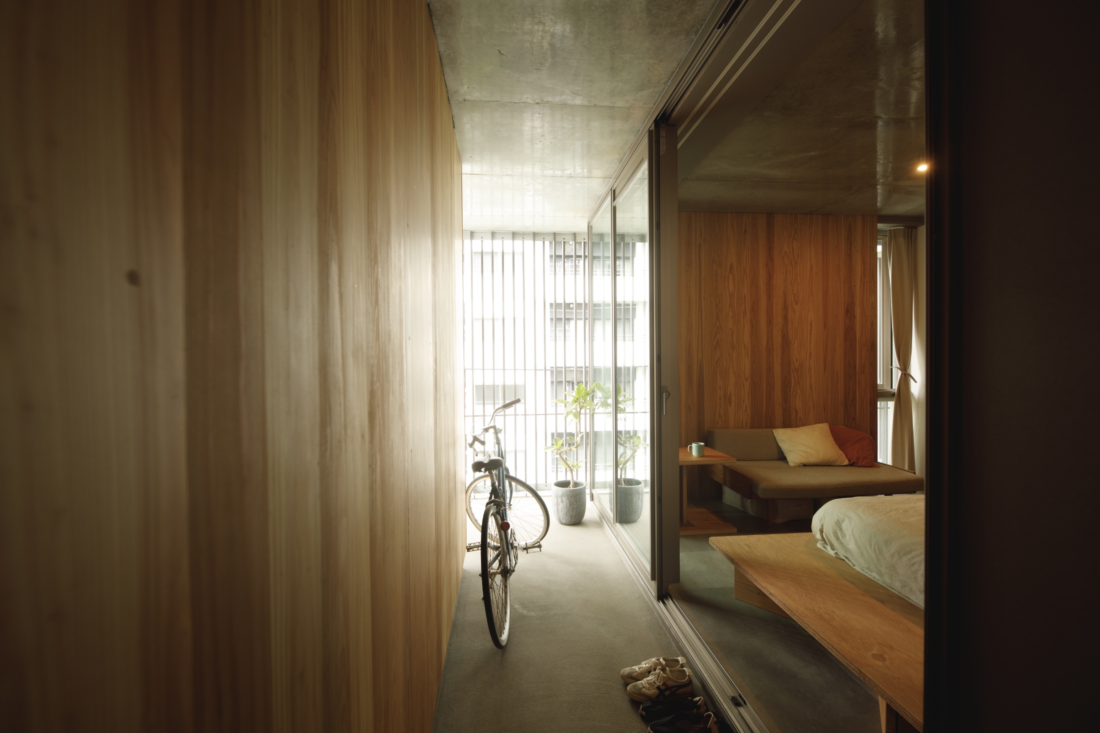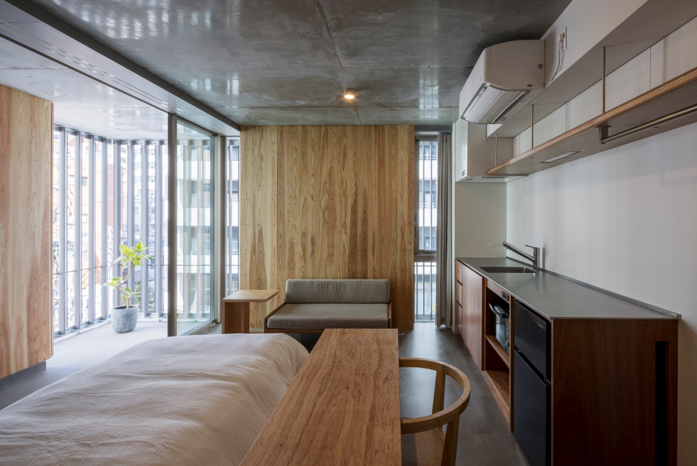 福岡市中心部に建つ当社単身寮の計画。計画地周辺は細い路地が多く、テナントビルや飲食店、集合住宅が立ち並ぶ界隈性のある街並みである。路地のある街の風景を建物内部に引き込み、住戸内に通り土間を設けた。街の雰囲気を連続させることで、人と街との緩やかな繫がりを生むサスティナブルな都市の集合住宅を目指した。