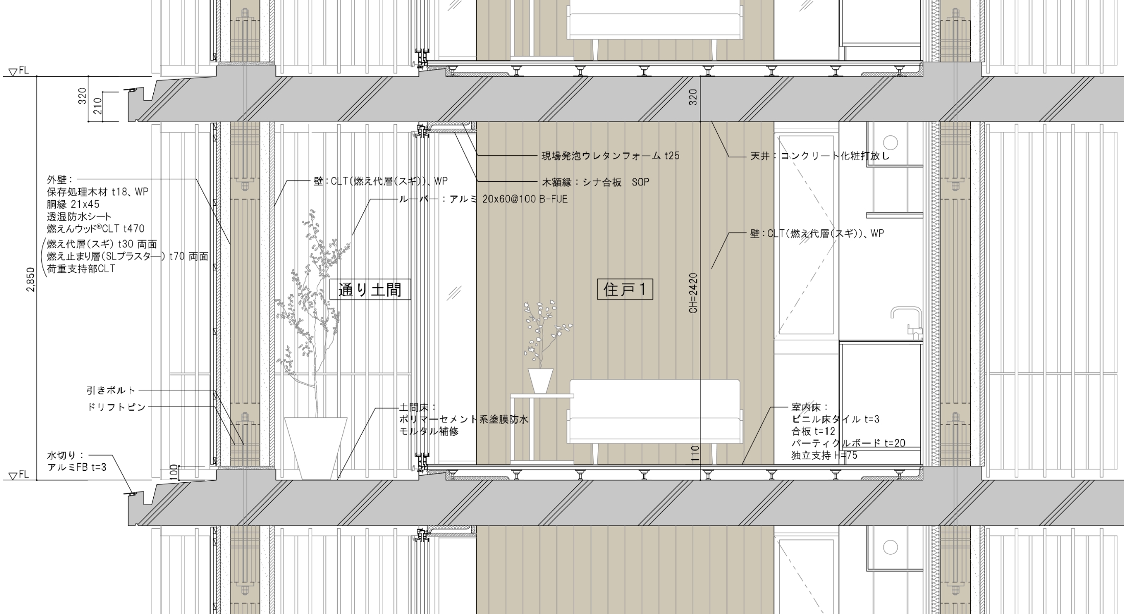 構造は、CLT壁/RC床の5階建て耐火木造建築とした。木の住まいは居住者に癒しを与えるとともに、環境に優しい都市の集合住宅を実現している。
