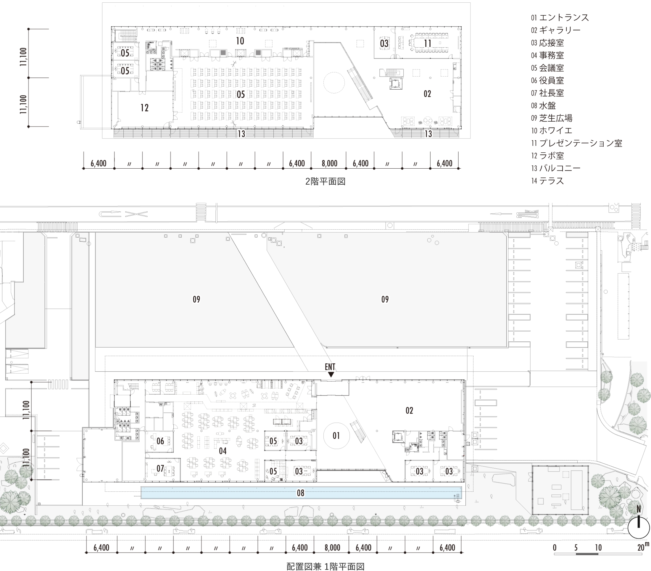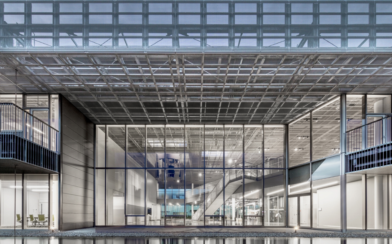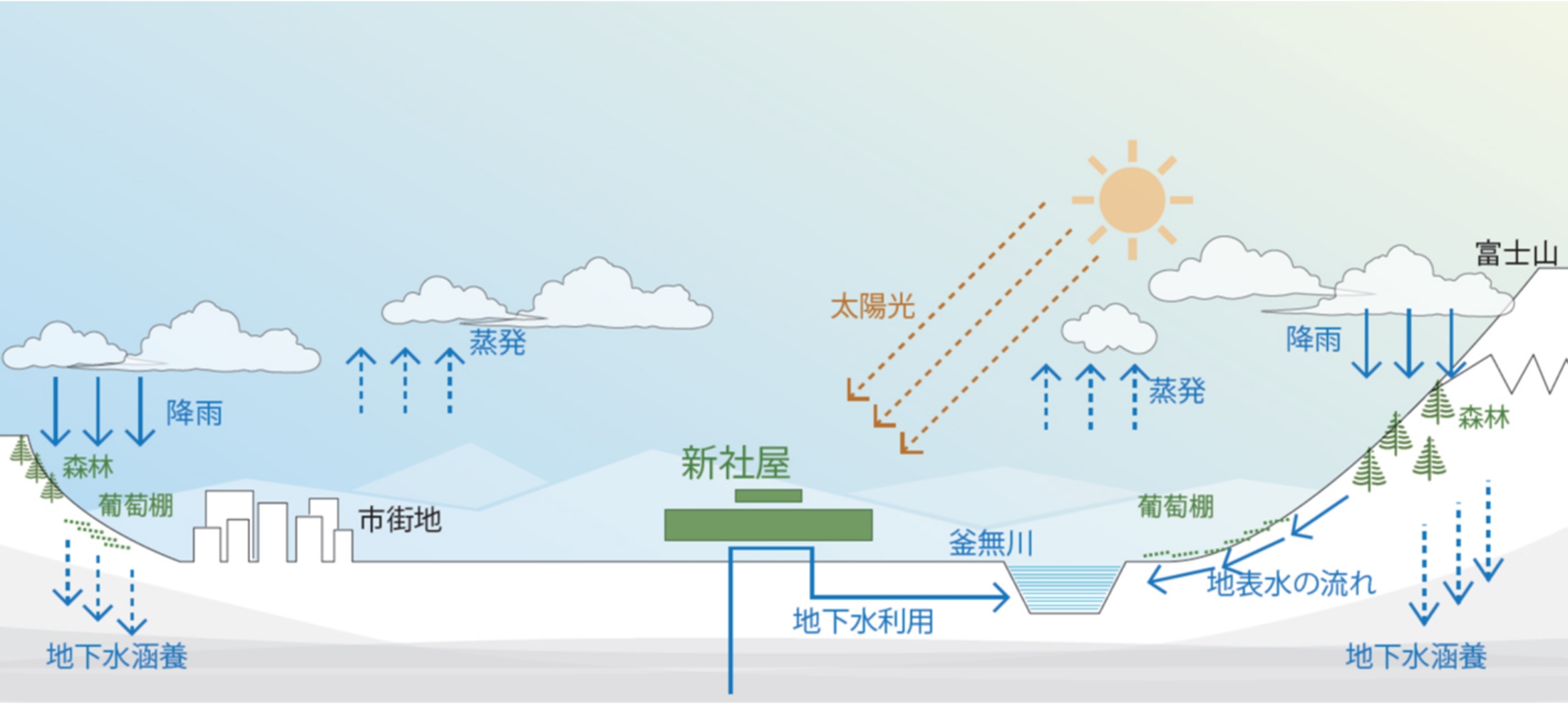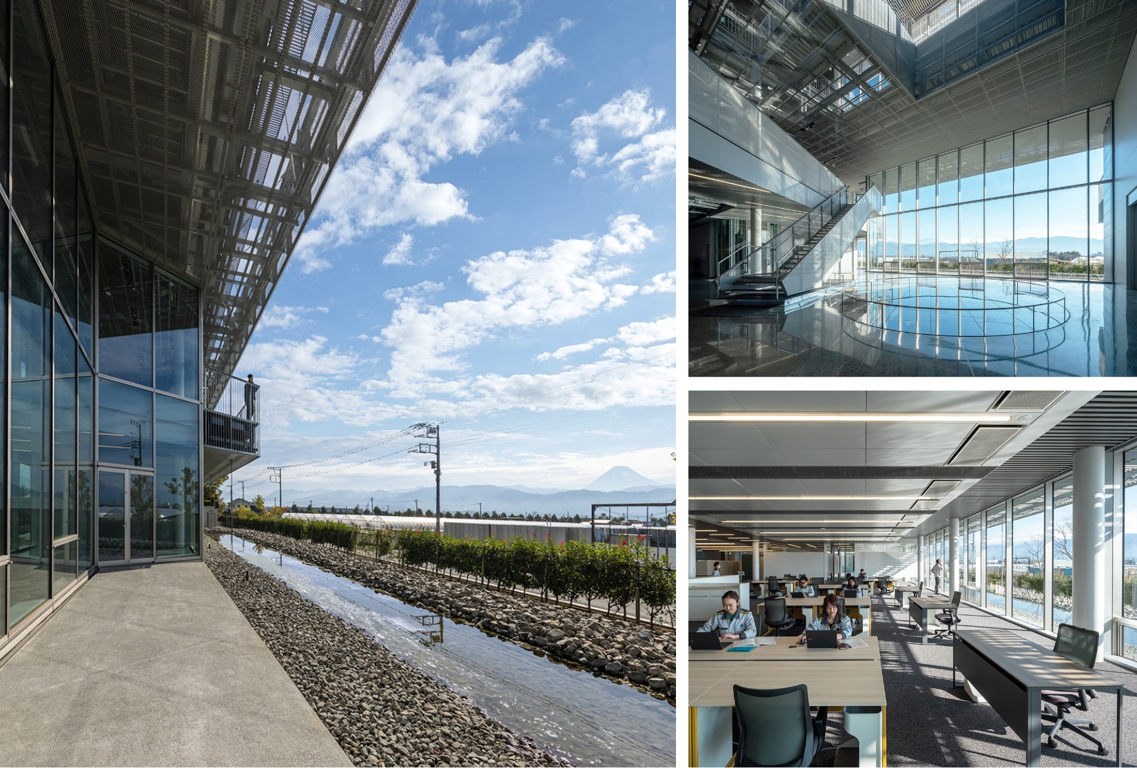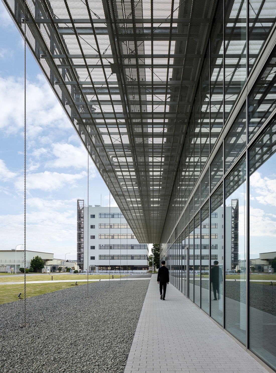 グローバル展開するマテリアルハンドリング機器メーカーの新社屋。厳しくも豊かな甲府盆地の⾃然環境において、農業⽣産効率を⾼めた甲州式葡萄棚をイメージし快適性と環境性能の両⽴を図った。
