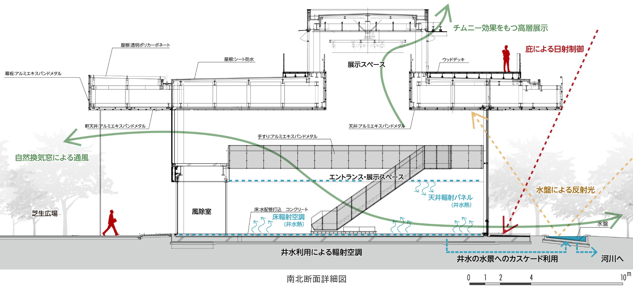 屋根は透過性の⾼いエキスパンドメタルで覆い⽇射遮蔽を図りつつ、換気⽤トップライトからの直接光や⽔盤からの反射光を室内に拡散させることで、葡萄棚の下にいるようなやわらかな光と⾵の⼼地よさを感じられる空間を創出している。