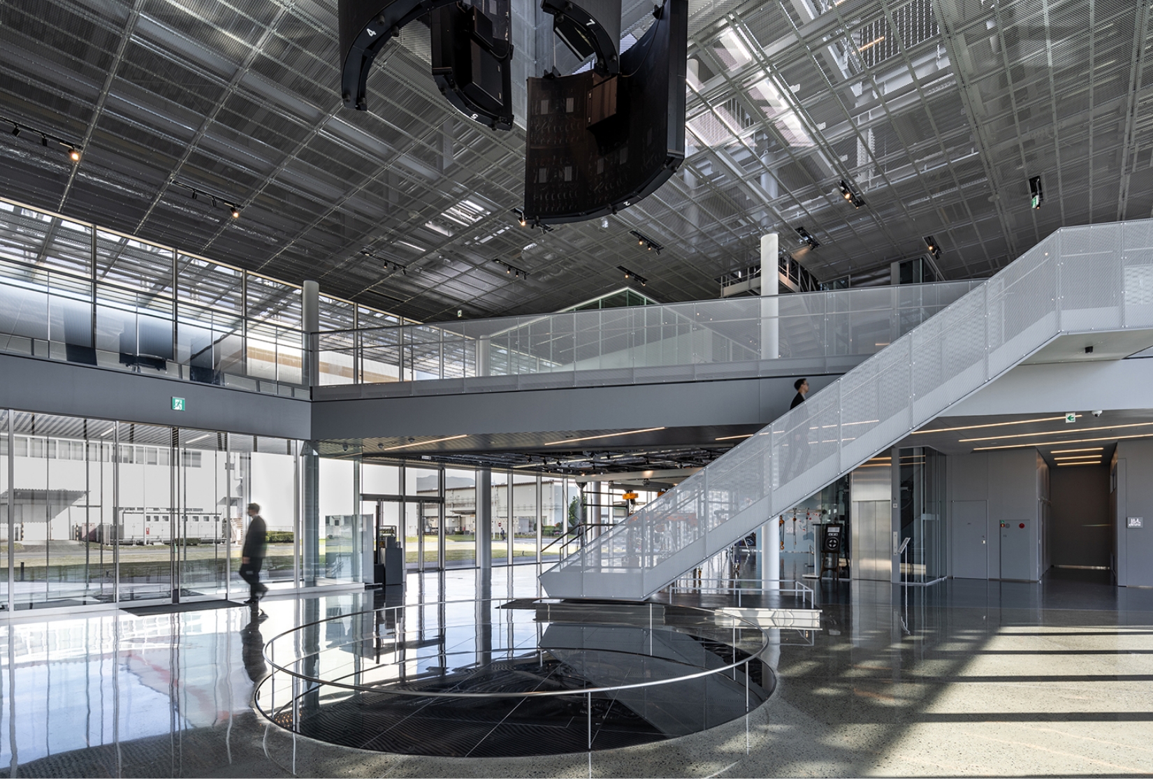 汎⽤材を主とした梁成250mmの鉄⾻によるフィーレンデール架構で、最⼤22mスパンの無柱空間を実現。豊富な井⼾⽔を利⽤した空調システムの冷温⽔管は、架構の上弦材と下弦材間を配管スペースとして有効活⽤している。