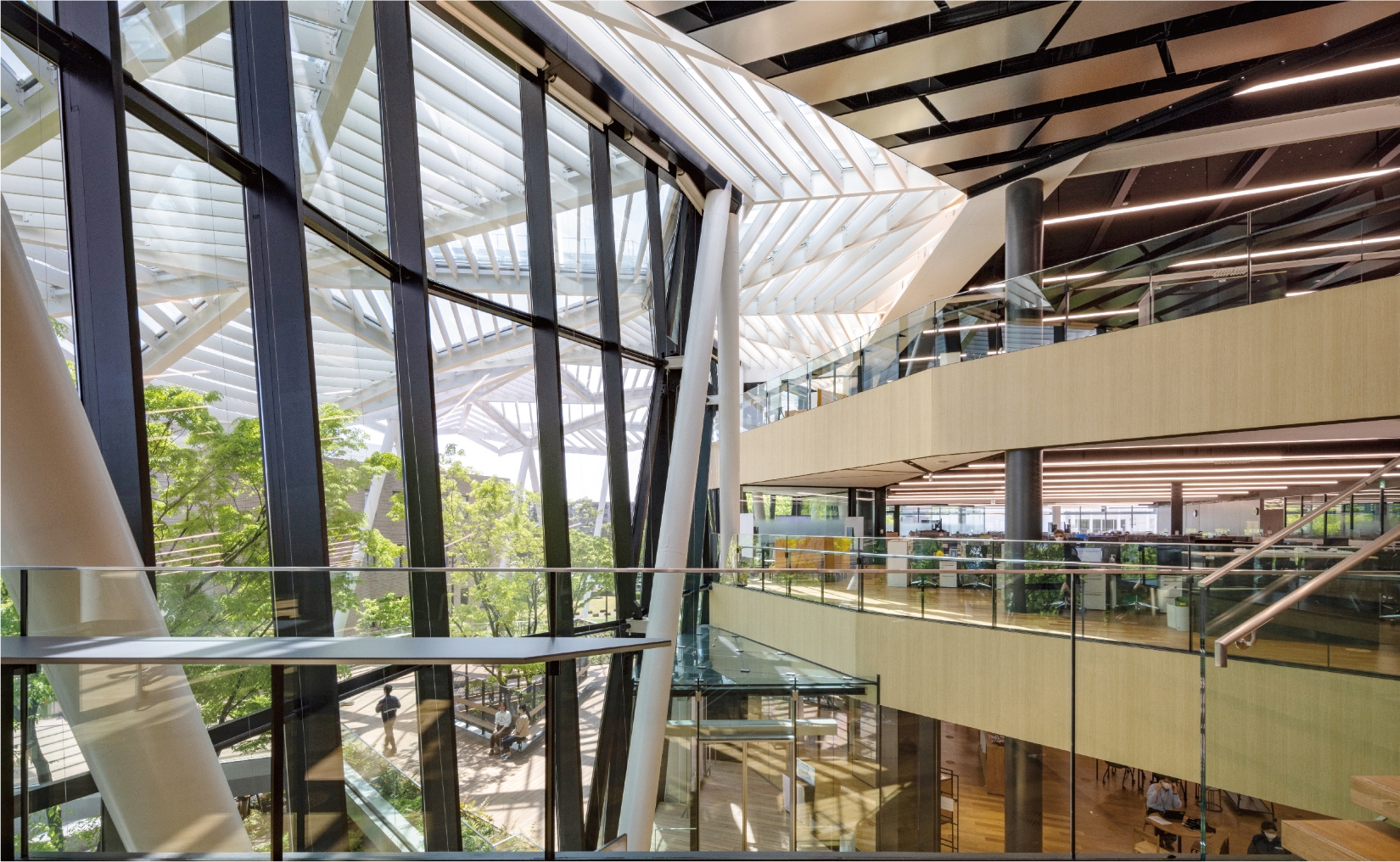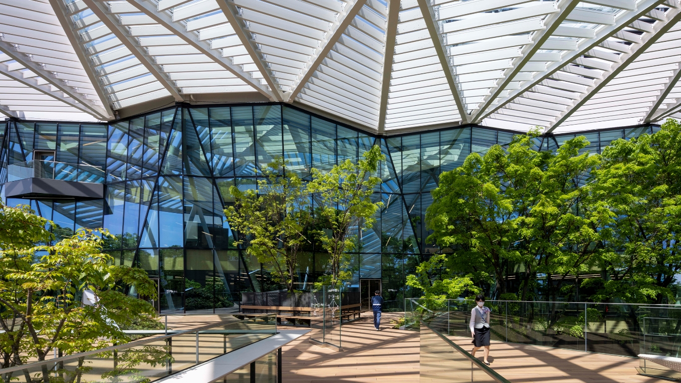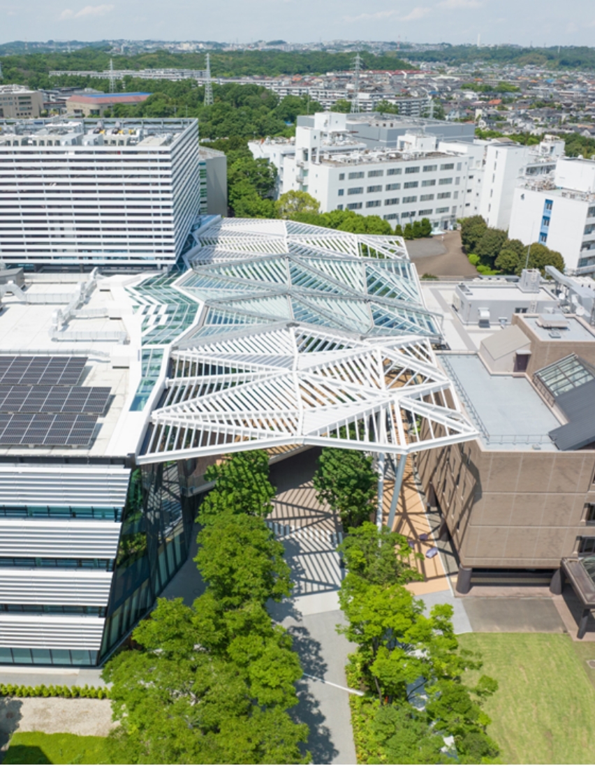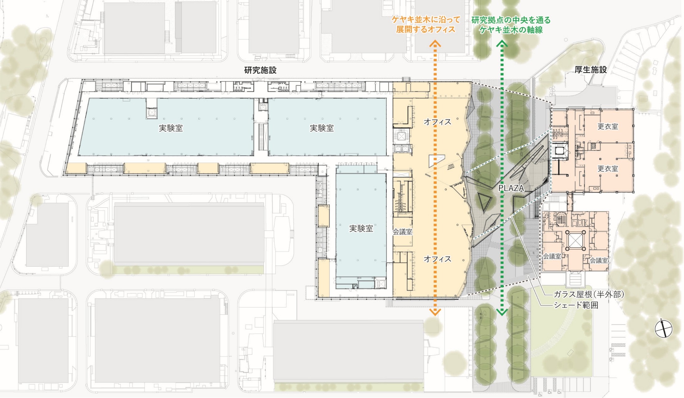 総合化学メーカーの研究所である。研究拠点の軸線となっている樹齢50年のケヤキ並木を挟んで、研究施設を新築、厚生施設を改修し、2棟間にガラスの屋根を架けてケヤキ並木を取り込み、建築と自然をつなげる構成とした。研究員は内部から常にケヤキ並木を感じ、自然と交感しながら、働き休息することで思考を開放し、新たな発想を生み出していく。こうした日々の自然との共生関係をつくりだす持続可能なひらめきの森を創出した。