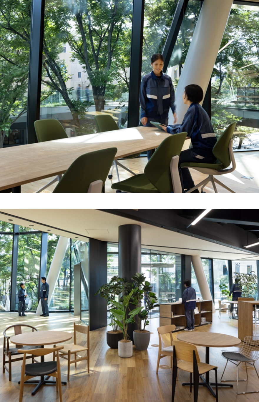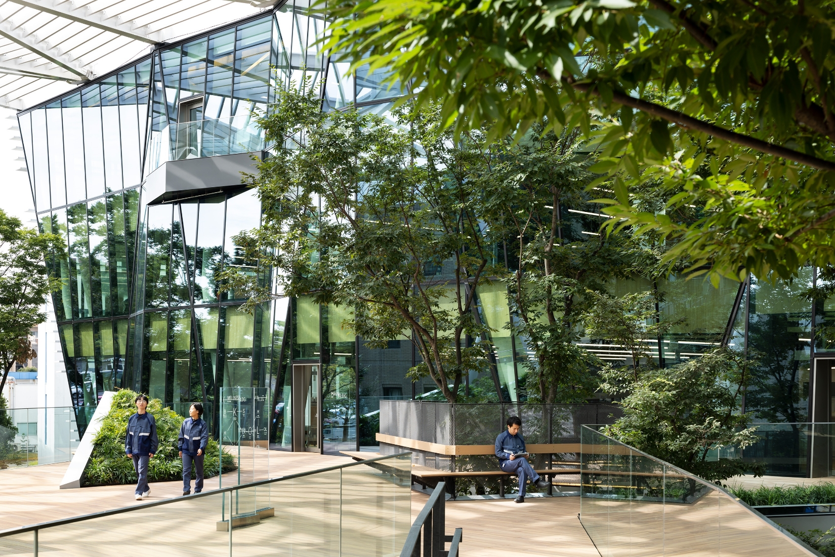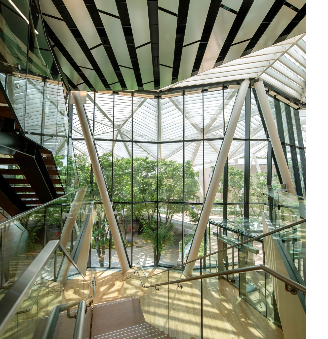 総合化学メーカーの研究所である。研究拠点の軸線となっている樹齢50年のケヤキ並木を挟んで、研究施設を新築、厚生施設を改修し、2棟間にガラスの屋根を架けてケヤキ並木を取り込み、建築と自然をつなげる構成とした。研究員は内部から常にケヤキ並木を感じ、自然と交感しながら、働き休息することで思考を開放し、新たな発想を生み出していく。こうした日々の自然との共生関係をつくりだす持続可能なひらめきの森を創出した。