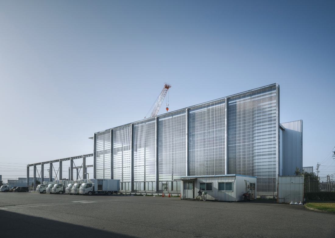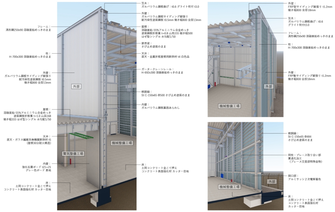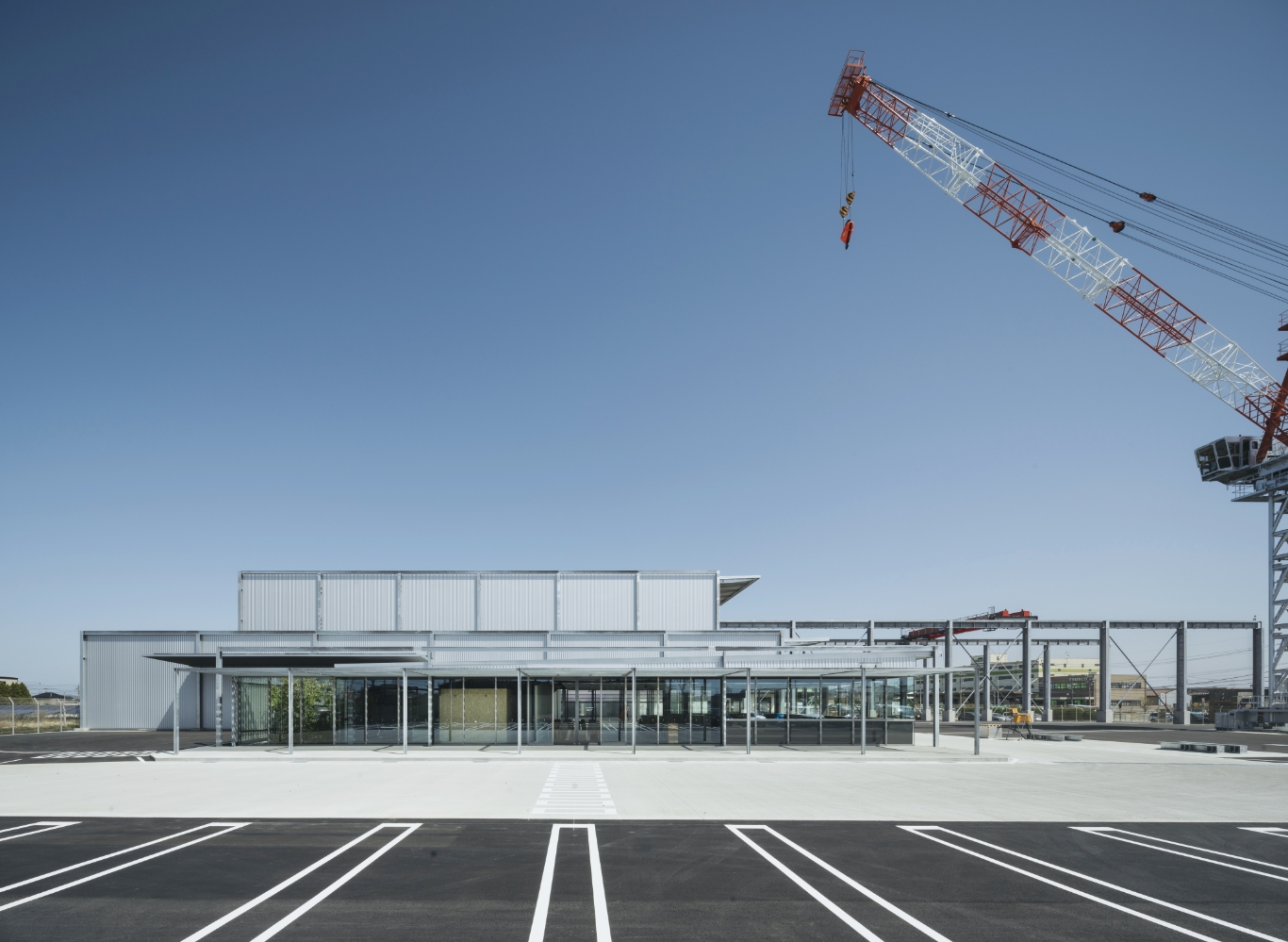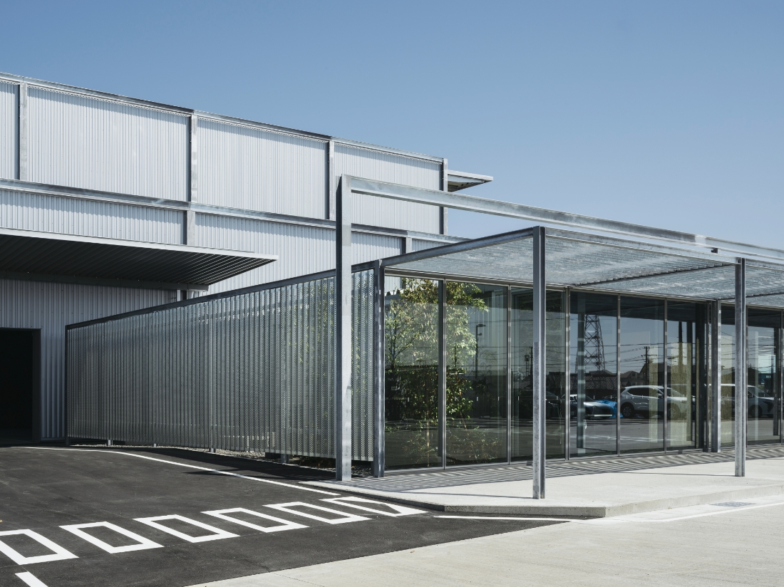 建設⼯事に使⽤する建設機械や電気機器の整備⼯場。構成要素同⼠の関係を再構築することで新たな建築表現を⽬指し、鉄⾻架構が外壁や屋根よりも外部側に表出する構成としている。⼀般的な設計では意識することがない数多くの部材(プレートやボルトなど)が表現としても性能としても課題となったため、設計初期から鉄⾻ファブリケーターとチームを組み、製作図レベルの精度の⾼い鉄⾻3次元モデルをベースに設計を進めた。建築設計者が描くスケッチに込められた意思が「BIM(ビルディング・インフォメーション・モデリング)」という無限に複製可能で、誰でもどこでも⾒られるものとして製作者や施⼯者に共有される。それにより、当初意図した鉄⾻架構の純粋無垢で⼒強い印象に加えて、丁寧で繊細な架構の表現を実現した。