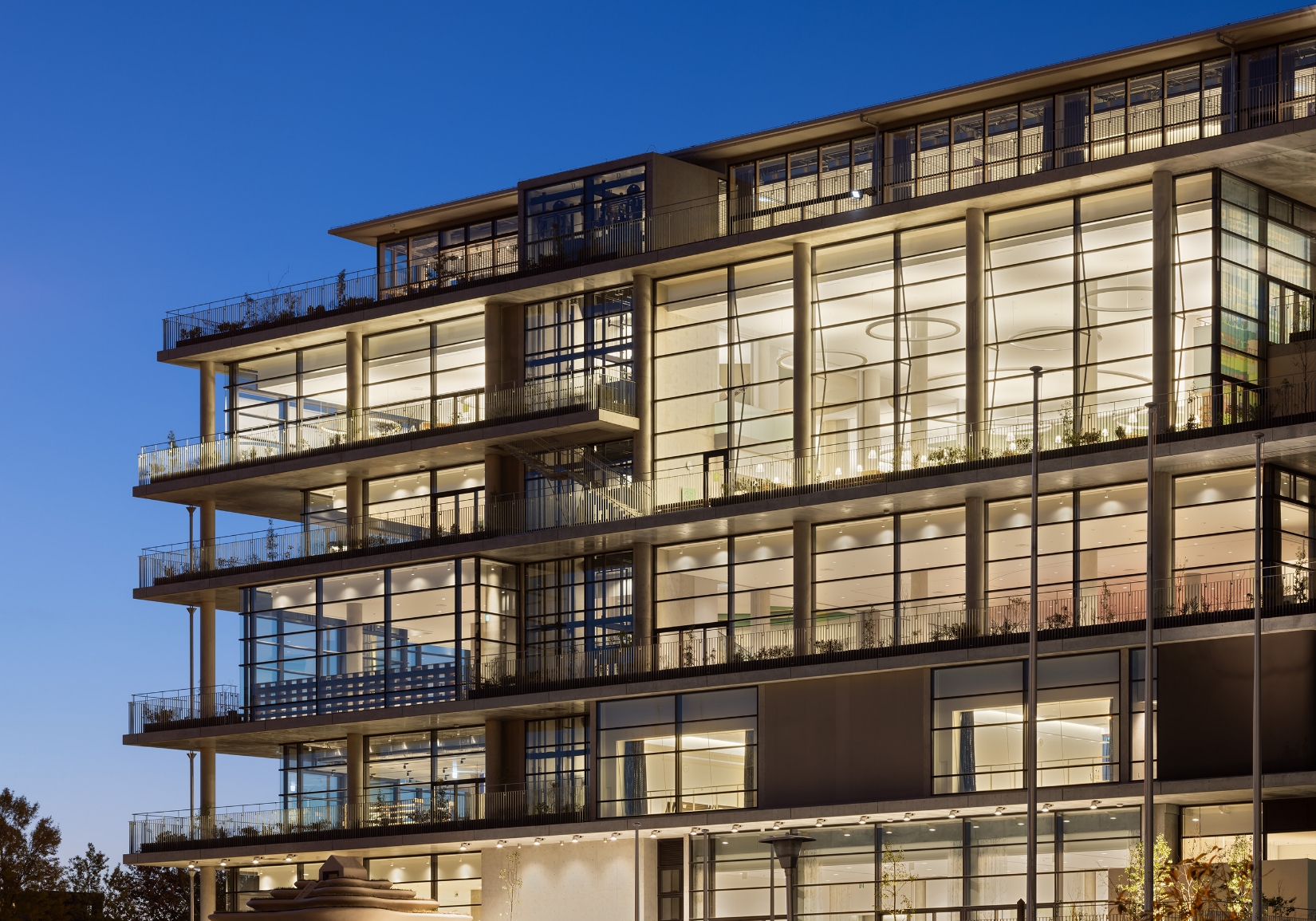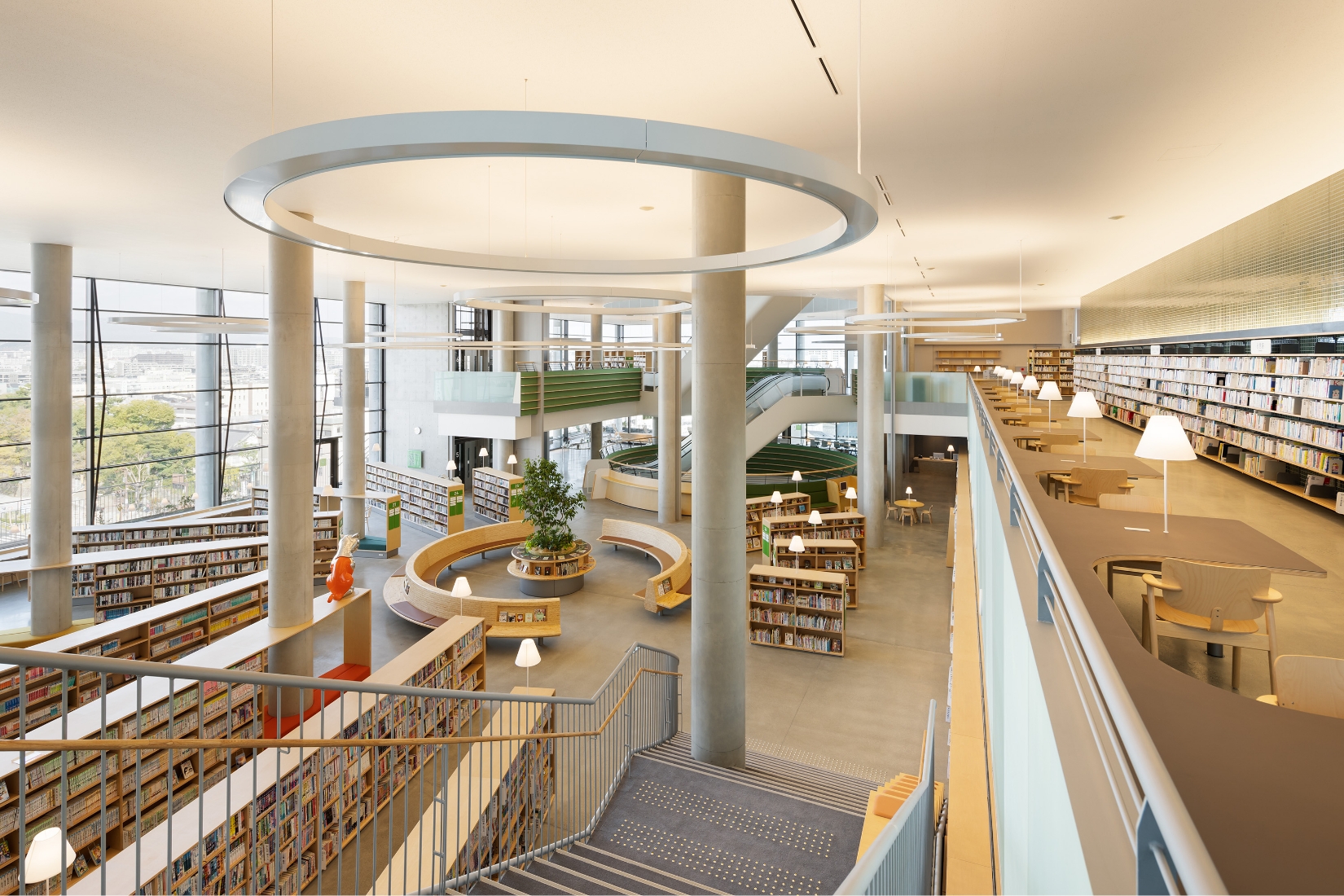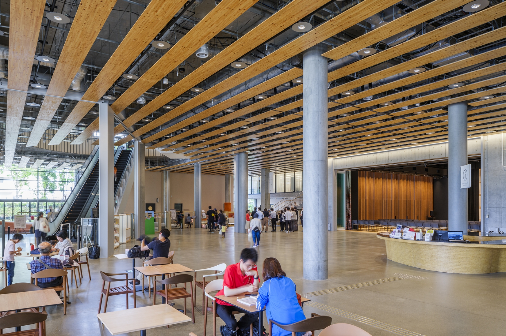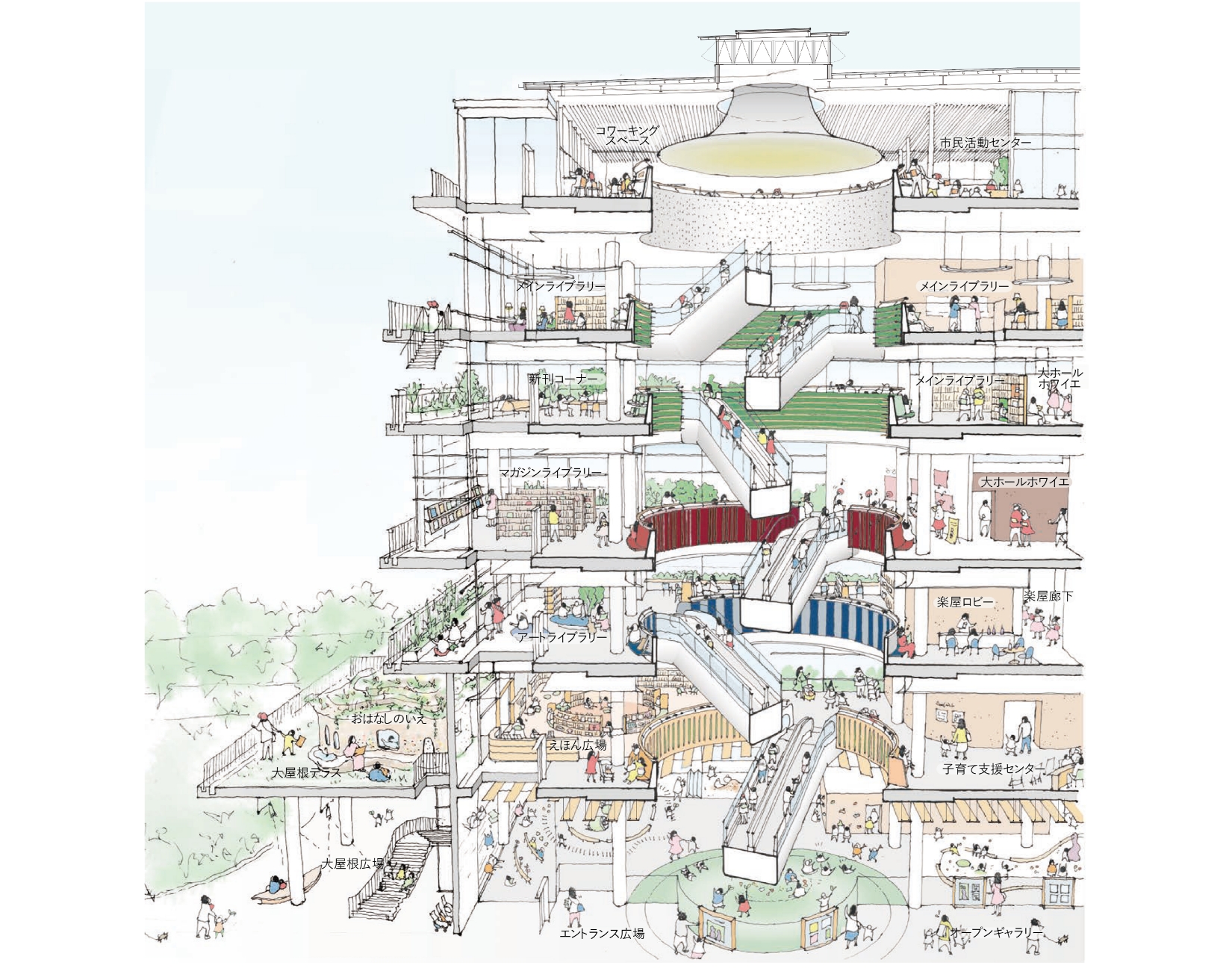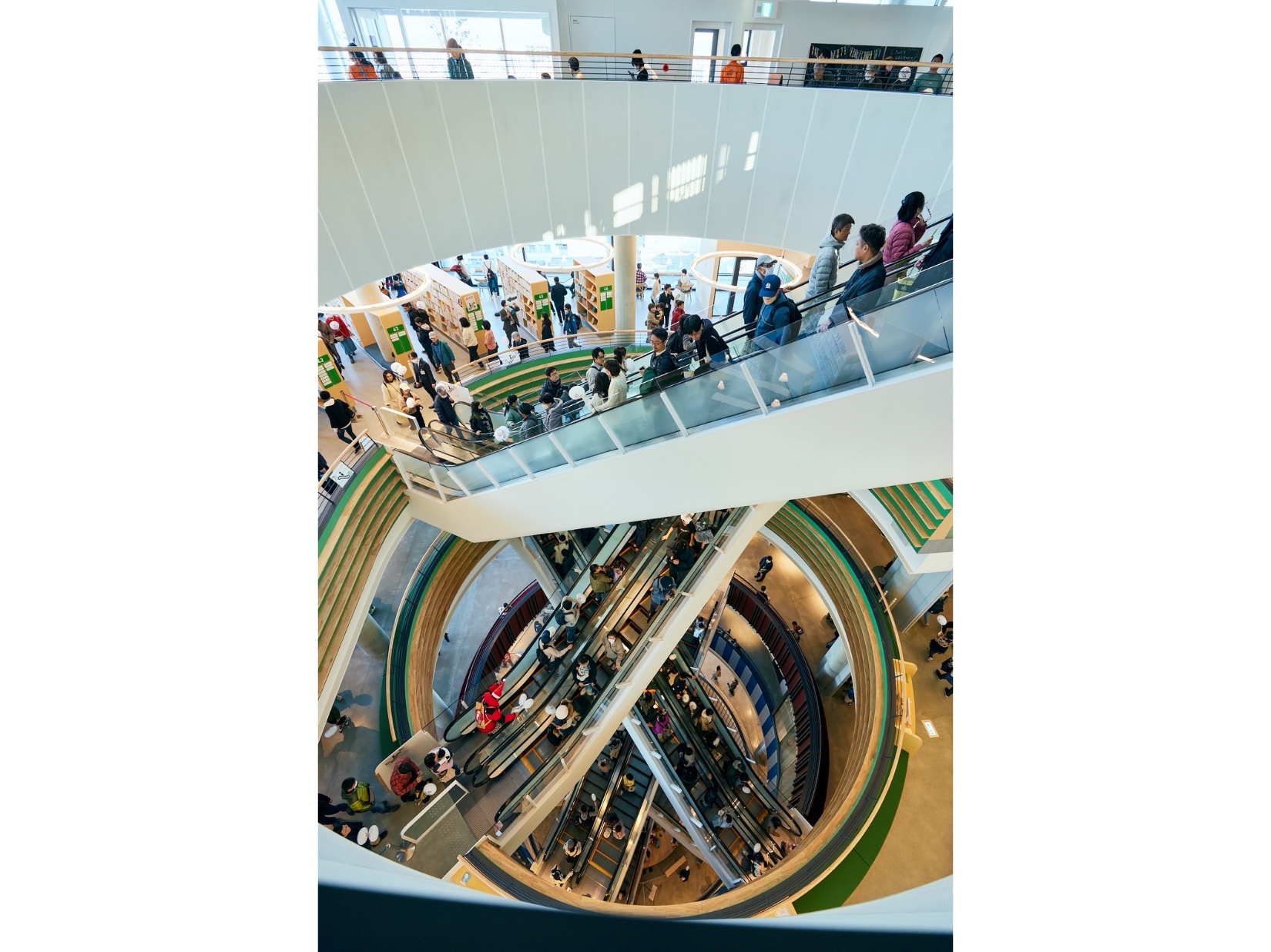 約50m×50m のフラットスラブと600φの丸柱を主体構造としたオープンなボリュームに、多様なプログラムを7 層に渡り積層させ、これらを「縦の道」と呼ぶ吹抜けの中に縦横無尽に渡されたエスカレーターにより、利⽤者の移動を誘発するつながりの空間を実現した。
