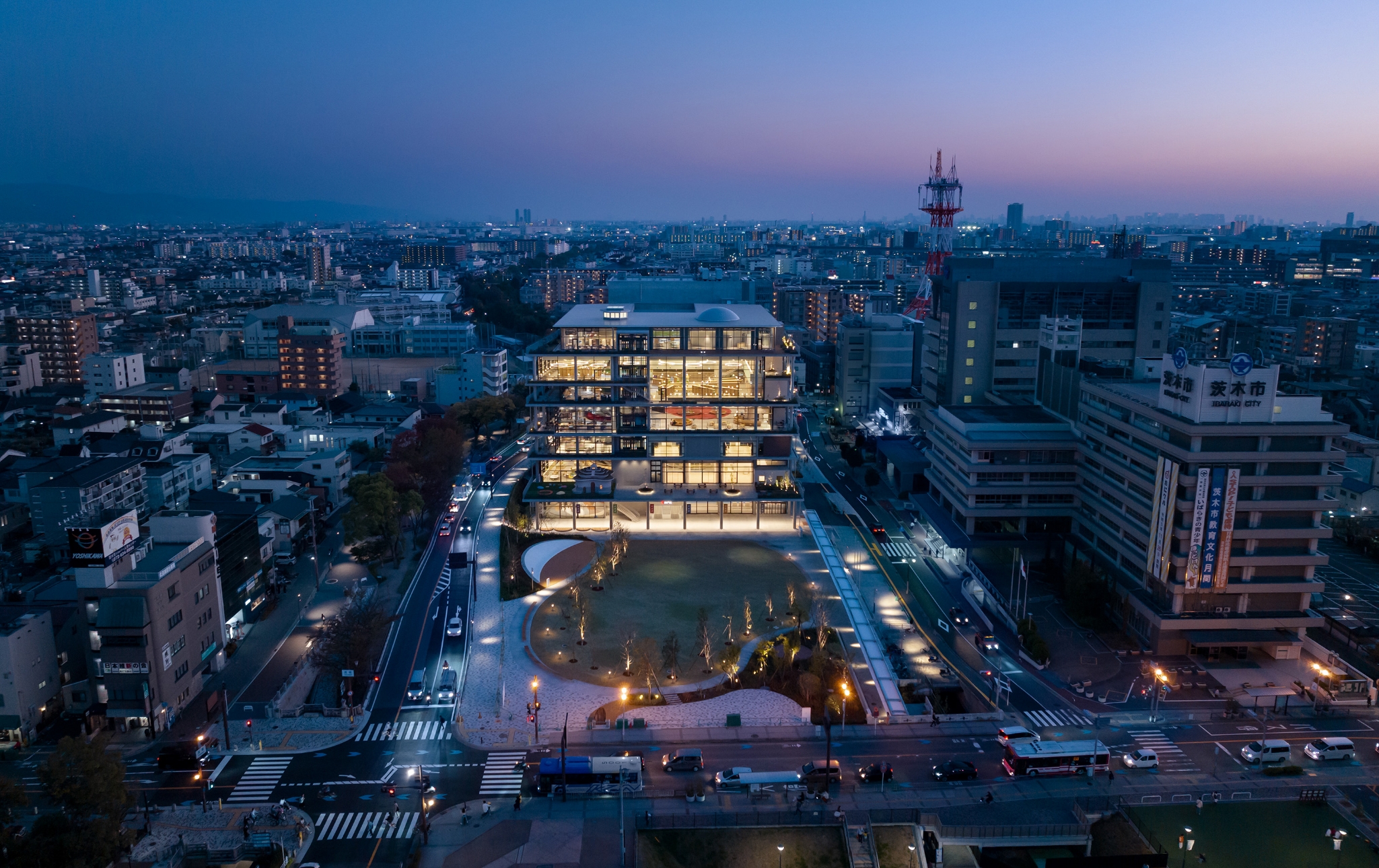 茨木市内を南北に約5kmも貫く元茨木緑道に接する緑豊かな環境に、大ホール、図書館、子育て支援施設、プラネタリウムなどを集約するプロジェクトである。都市計画公園との一体整備に加え、この空間にいるだけで、「日々何かが起こり、誰かと出会う」、ランドスケープと建築が相互に浸透し合う、立体的な公園を目指した。