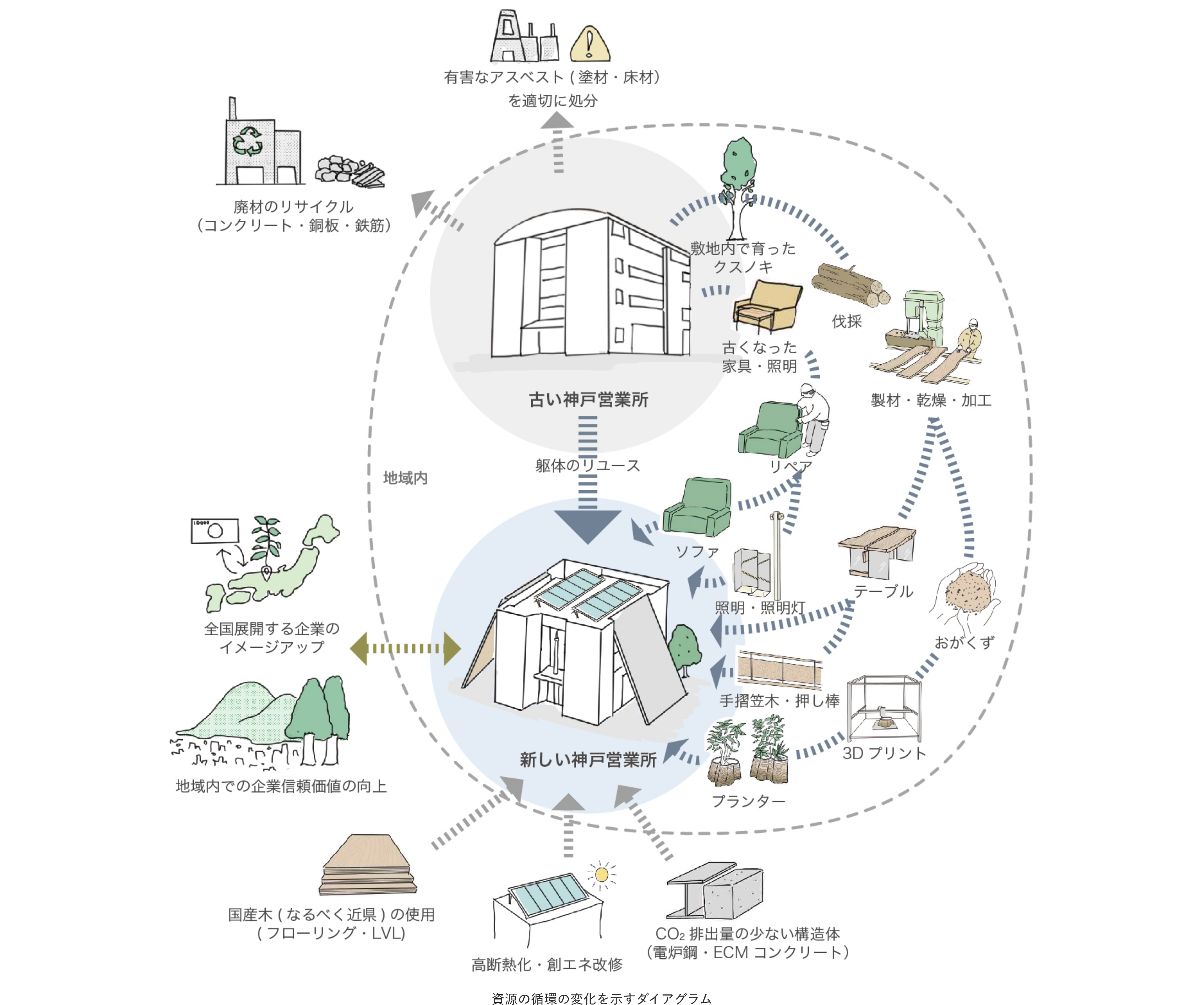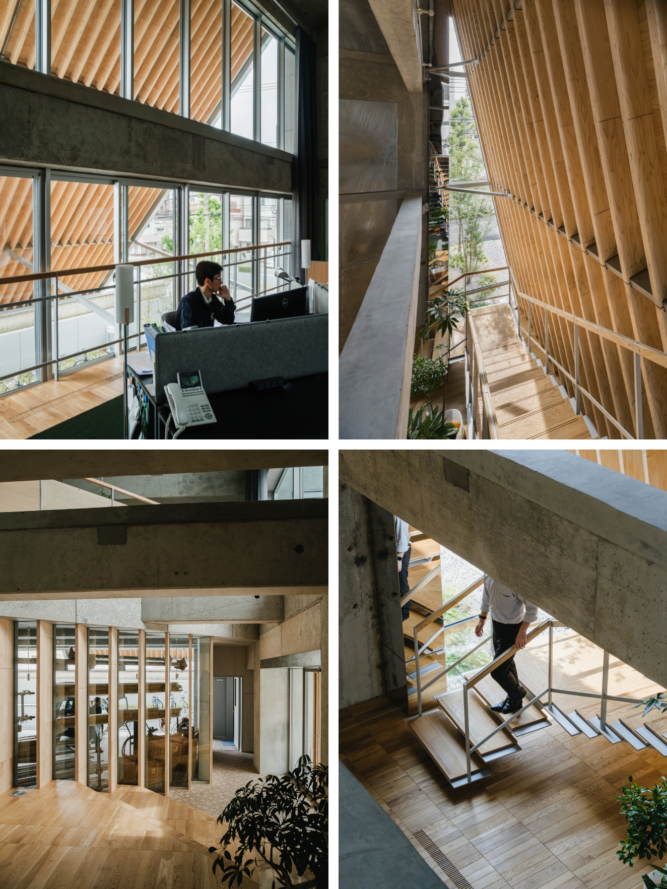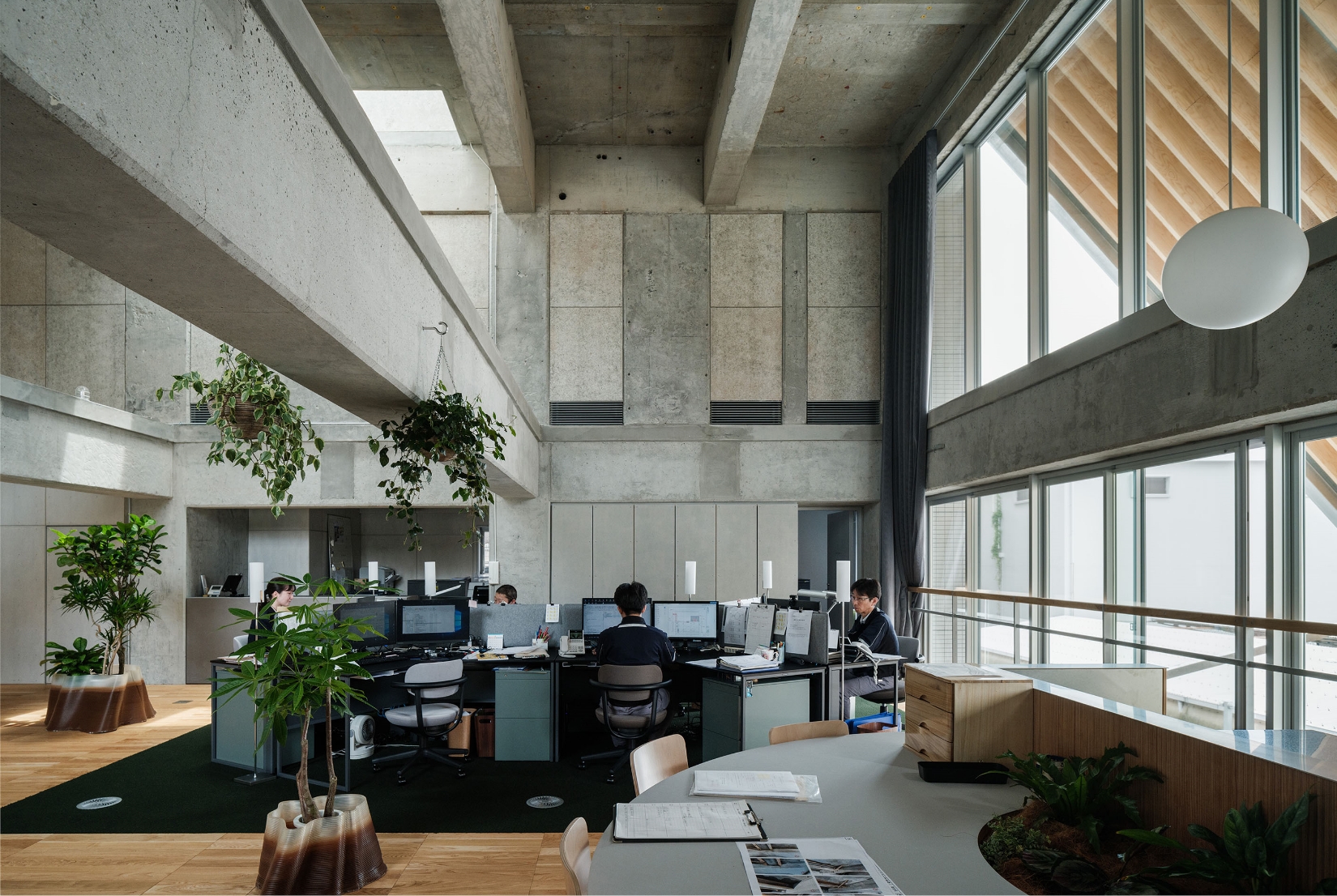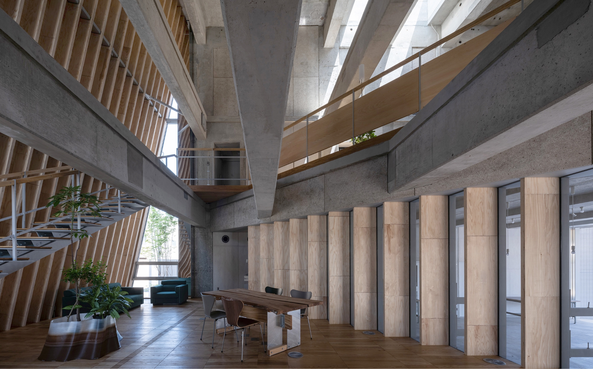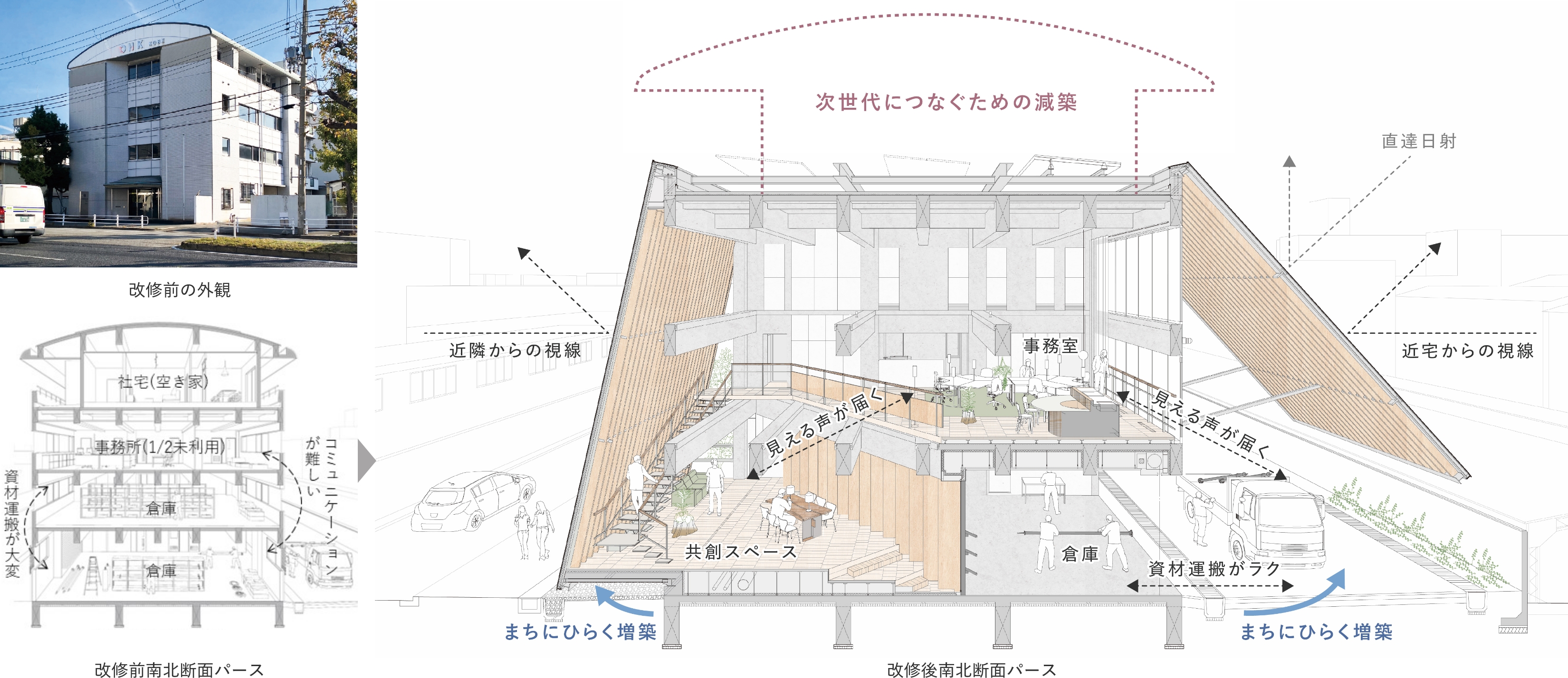 当初は解体され、建替えられる予定だった築35年の既存建築を、躯体と外装を残して再利用し、スクラップ&ビルドを超える価値の創出を目指したプロジェクト。不要となった4階の社宅と3階スラブを減築し、軽くなった分で既存躯体から大庇を吊り下げ、基礎をつくらず増築することで不足していた1階の床面積を拡張した。これまで時を刻んできた既存RC躯体のもつ魅力を発見・抽出し、そこに木のもつ特有の力を組み合わせることで、時の流れを味方につけ、100年大切に使われる建築を目指した。
