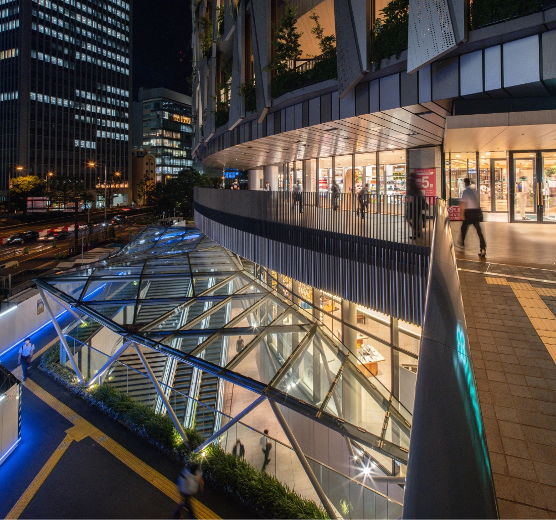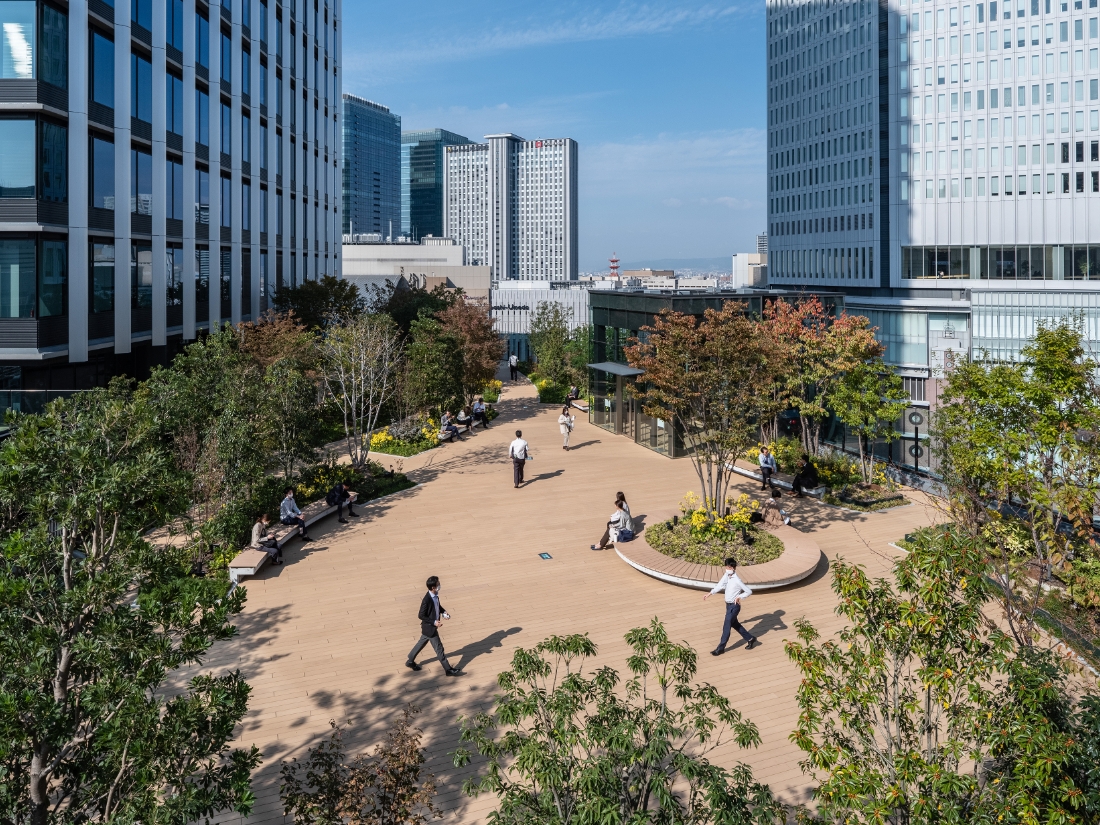 そこで、官民境界を越えて、地上に活力が溢れる大阪梅田の起点となる立体的な3万3000㎡の街路形成を行い、まちと建築をつないだ。整備した立体街路によって立体的な循環を促進し、⼈の往来に「回遊性」と「選択性」を与え、周辺エリアとの⾯的なつながりの強化を実現し、⼤阪の重要な都市核の⼀つとして梅⽥の魅⼒を⾼めている。