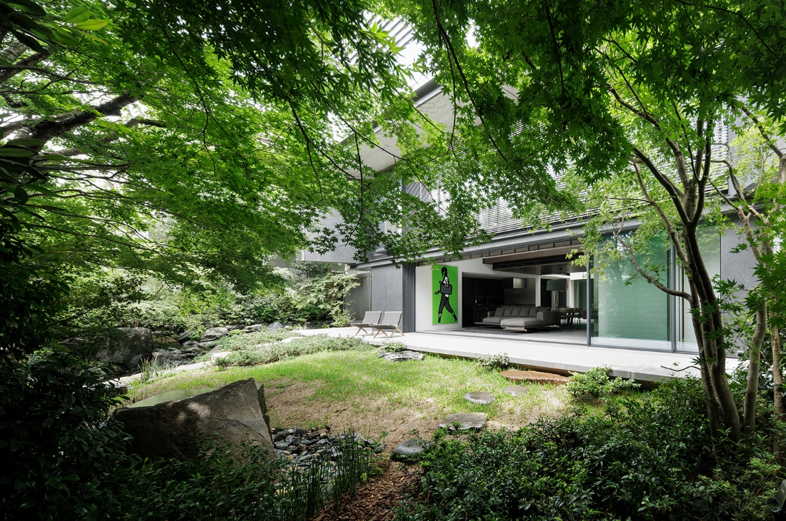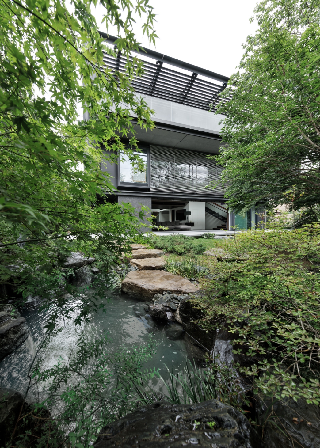 都内有数の丘陵地の⼀⾓、閑静な住宅街に計画された個⼈邸です。豊かな湧き⽔や、近隣に親しまれてきた樹齢約80年の⼤桜など、地域のかけがえのない資産を継承して計画しました。隣接する既存本宅を拡張するプライベートな場として、近接するオフィスを延⻑する⾃⾝のサテライトとして、また、来客を迎える迎賓の場として利⽤される別邸です。アートコレクションや調度品が数多く収められた空間は、オーナーにとって思い出を内包する空間でもあります。場の記憶と個⼈の記憶が重なり、⾵景の中で溶け合い、新たに歴史を刻んでいきます。