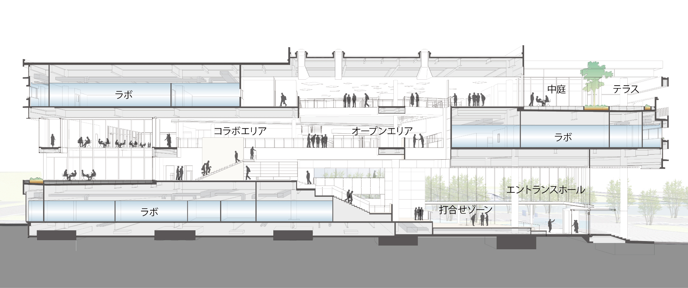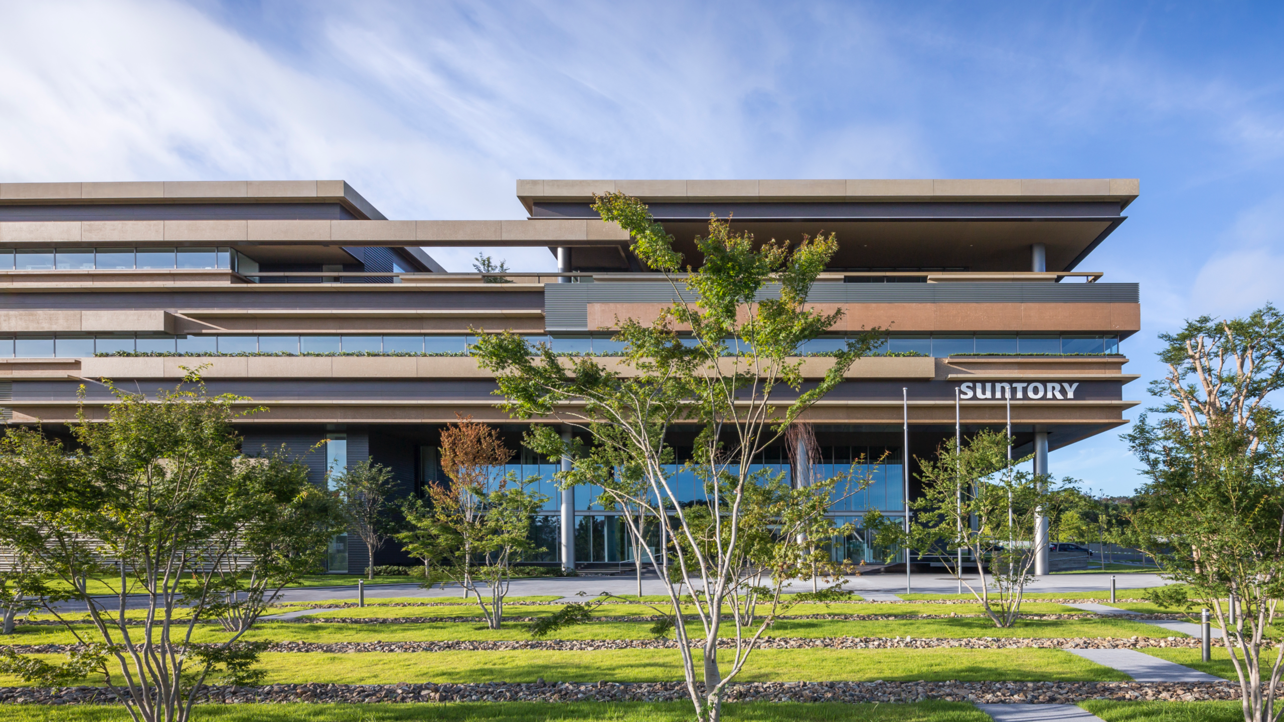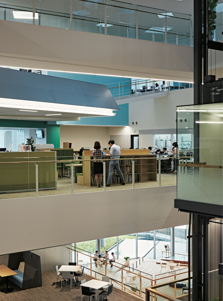 社内外の「知の交流」により未来価値を創造することを目指し、既存拠点の機能を集約した研究拠点である。外周にはバリアを設けず「外知」の交流を誘導する四季折々のオープンランドスケープを計画し、外装は「よい水(研究)はよい土(環境)から」の理念になぞらえ、地層のように重なる水・緑・土をコンセプトに構成した。内部には、研究者間の接点を増やすオープンラボを設け、ずれながら積層されたオープンエリアにテラスやボイドを挿入して、発散・集中を促す流動的で心地よいワークプレイスを創出した。