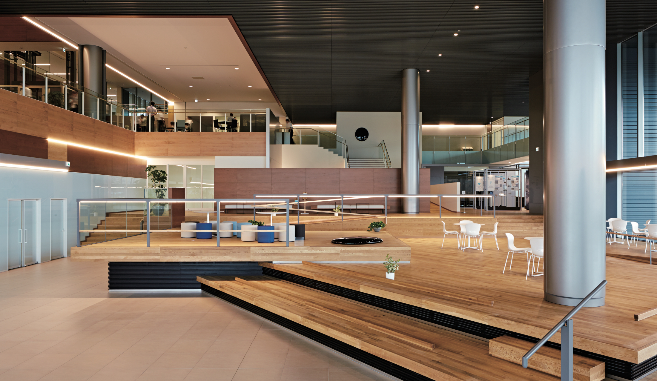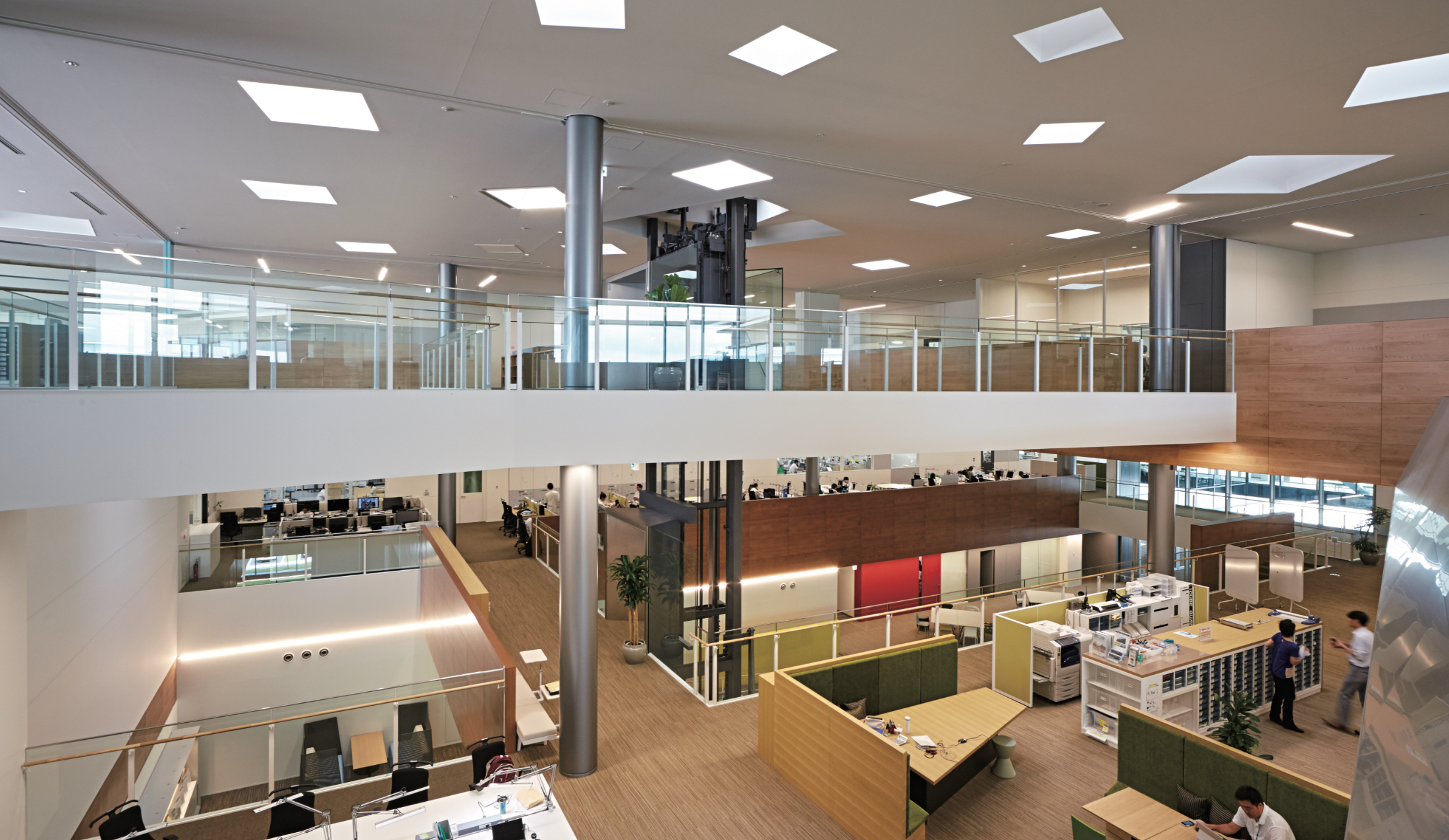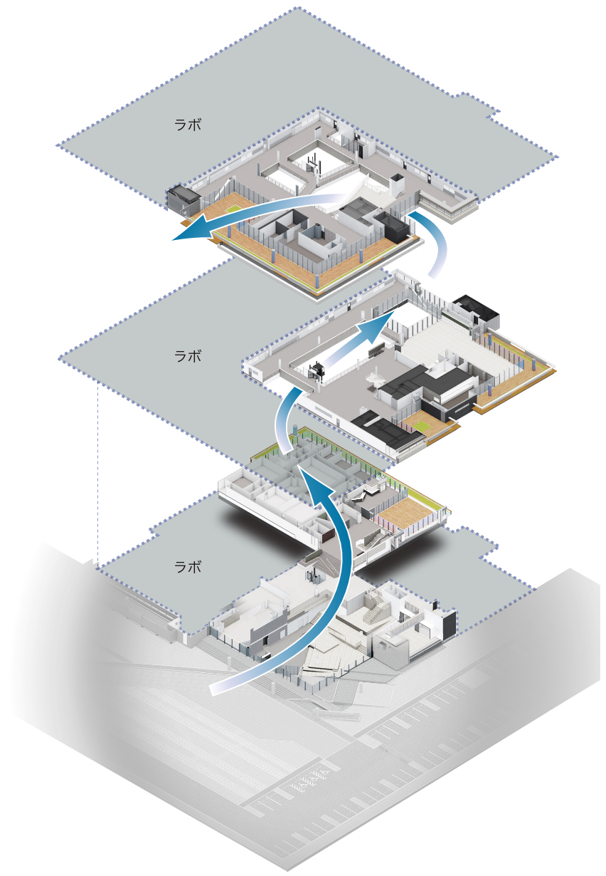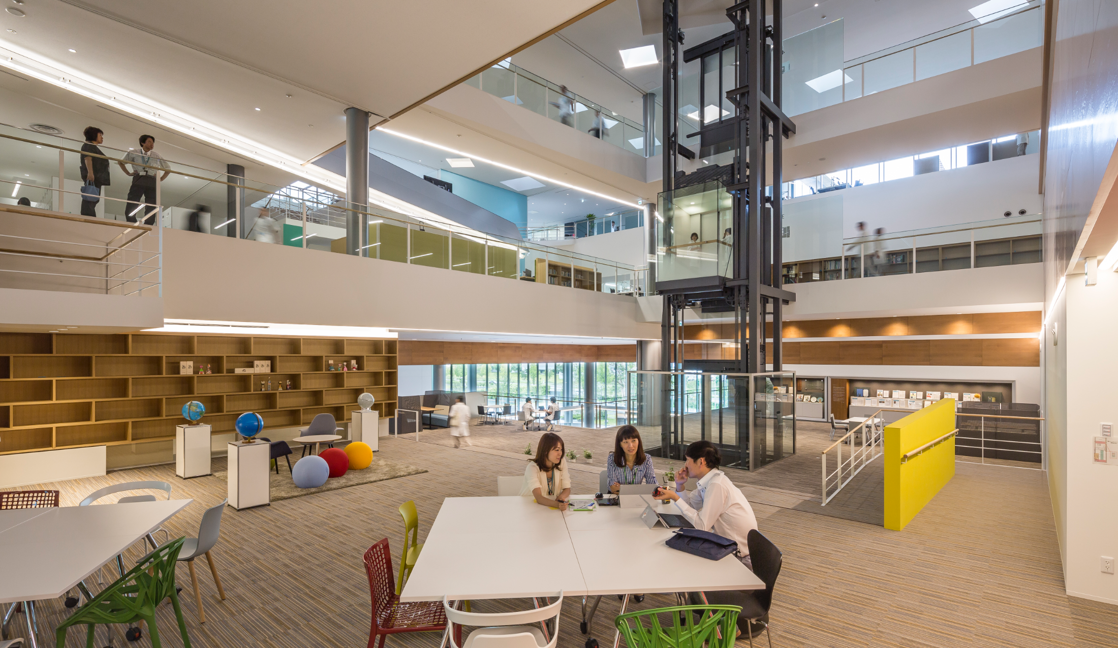 社内外の「知の交流」により未来価値を創造することを目指し、既存拠点の機能を集約した研究拠点である。外周にはバリアを設けず「外知」の交流を誘導する四季折々のオープンランドスケープを計画し、外装は「よい水(研究)はよい土(環境)から」の理念になぞらえ、地層のように重なる水・緑・土をコンセプトに構成した。内部には、研究者間の接点を増やすオープンラボを設け、ずれながら積層されたオープンエリアにテラスやボイドを挿入して、発散・集中を促す流動的で心地よいワークプレイスを創出した。