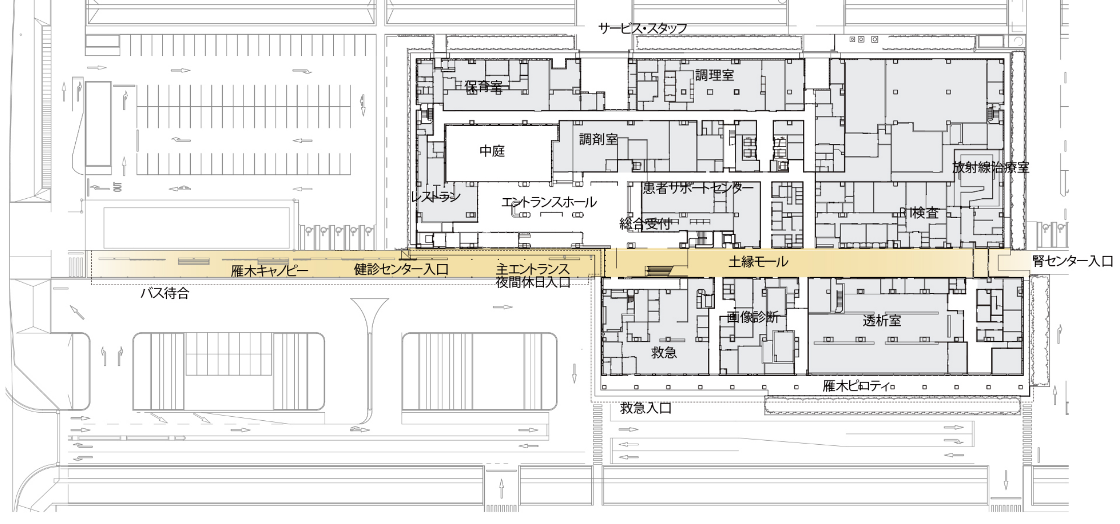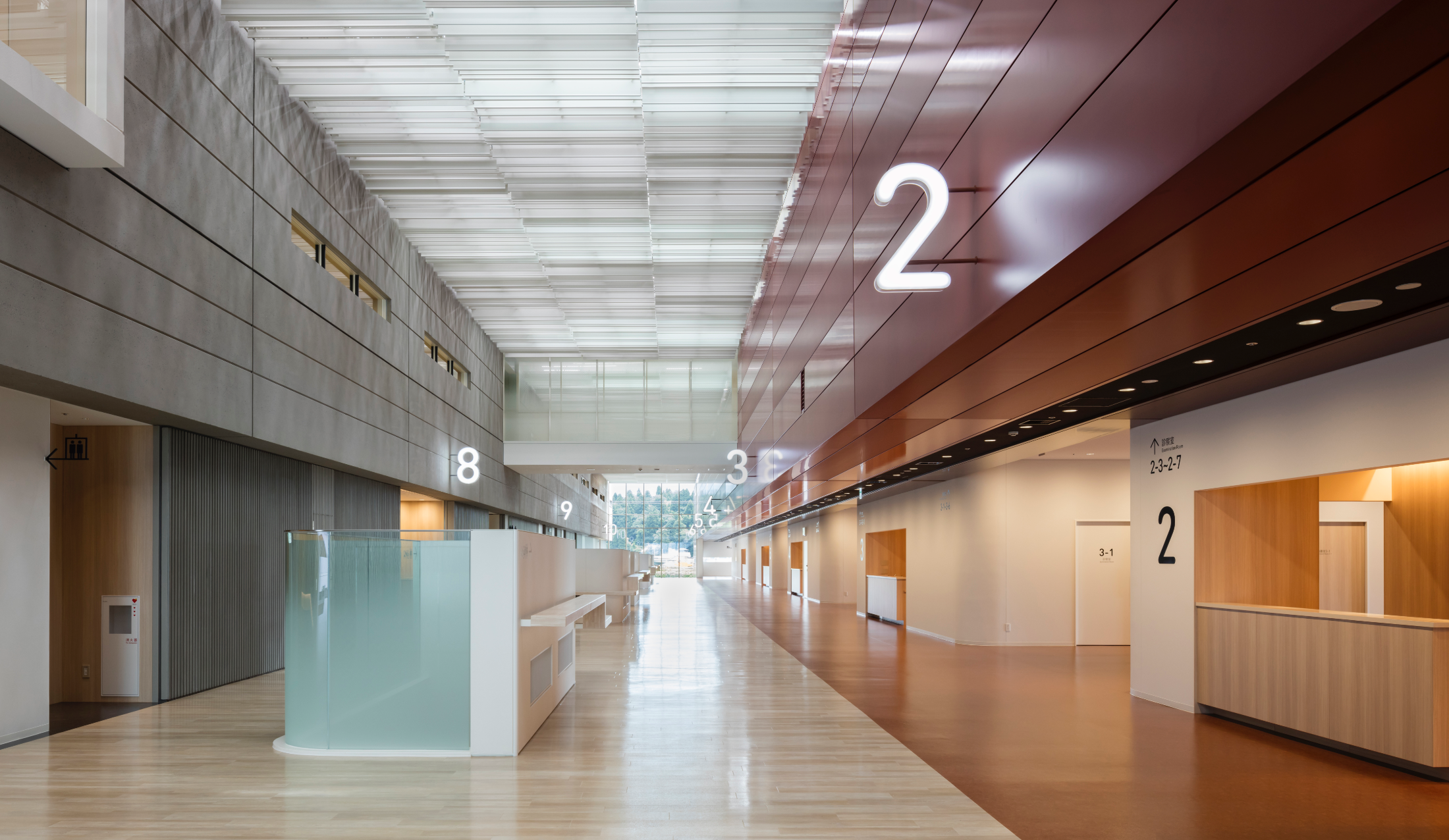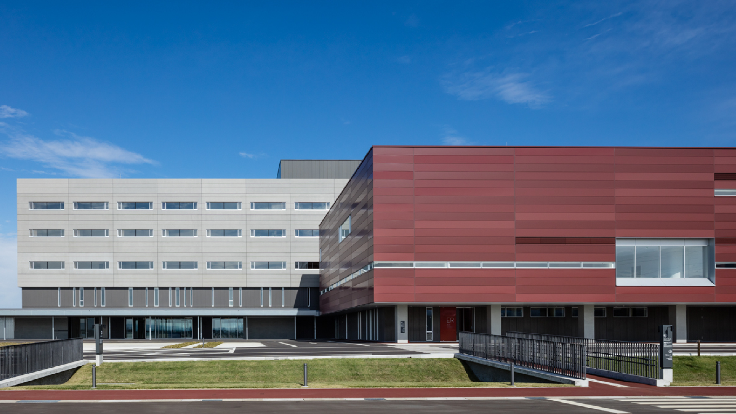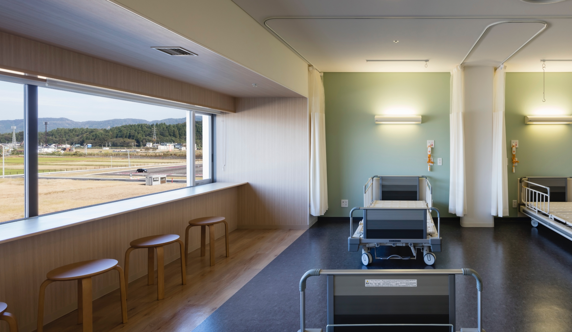 新潟県中越地方の急性期病院の移転計画である。地域の伝統的建築形式である中門造り(民家形式)、土縁(可変する縁側)、雁木空間を、現代的な解釈を行い計画に取り込み、地域風土や周辺環境との調和を図っている。病棟中心部には医療スタッフのコミュニケーションを誘発するための吹き抜け階段を設け、病室の中にはデイニッチやスタッフピットなどの診療や相談ができるスペースを配し、より多様に医療スタッフと患者家族が関わりあえる場を設けることで、チーム医療を実現する新しい地域医療拠点の創出を目指した。