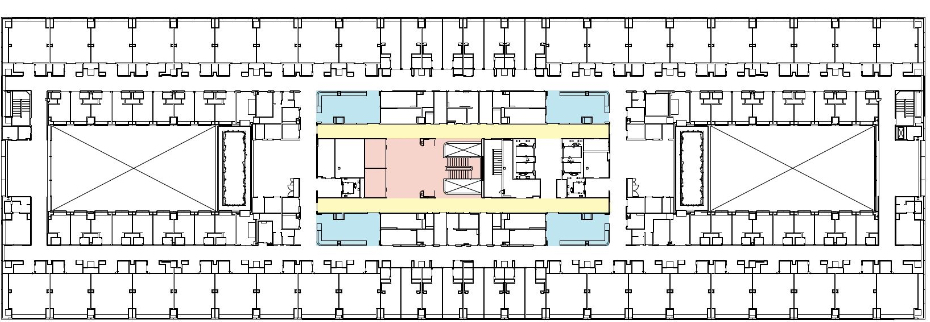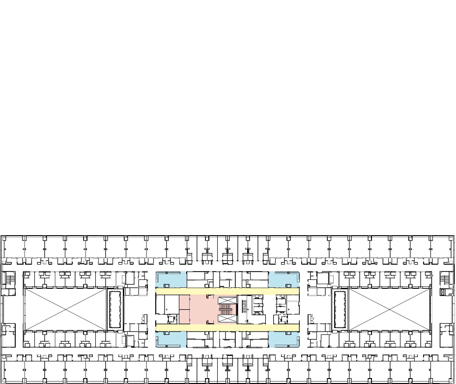病棟中央のスタッフベース®。3層吹き抜けの階段とカンファレンススペースで構成された余白空間が、スタッフ間のコミュニケーションを誘発する。