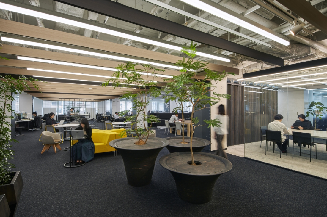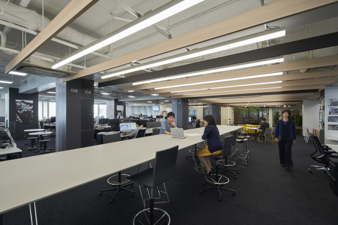 デジタルとアナログの両⽅のコンテンツを活⽤する、これからのものづくりのための開かれたスタジオをワークスペースの中央に計画した。その象徴として、ステンレスという硬くて重い材料を、3Dプリンターを⽤いて、これまでにない肌触りを持ち、⾃由で軽い形態によって多様なアクティビティを誘発する「HAGOROMO BENCH」を狭間に置いた。
