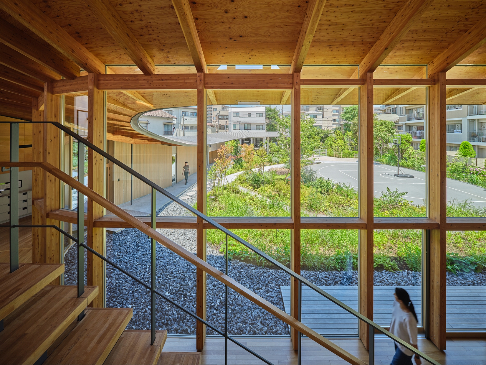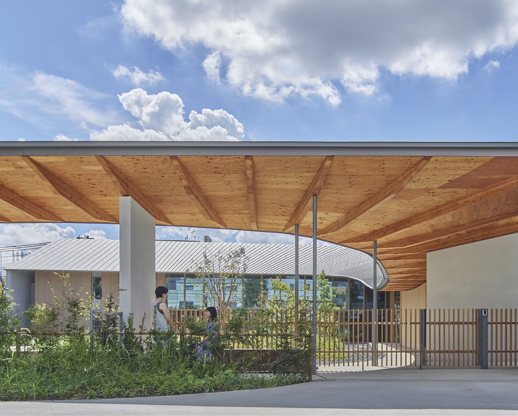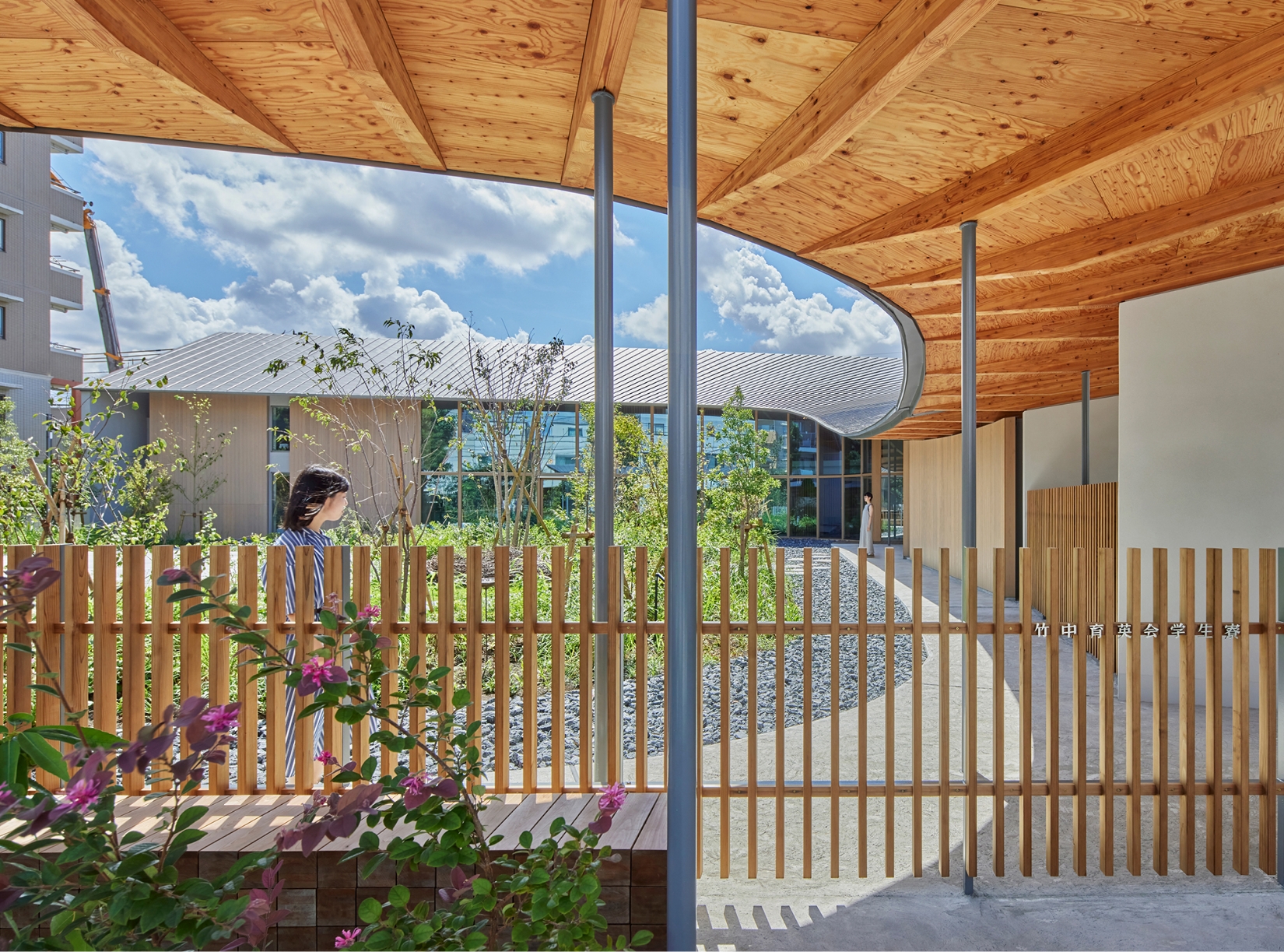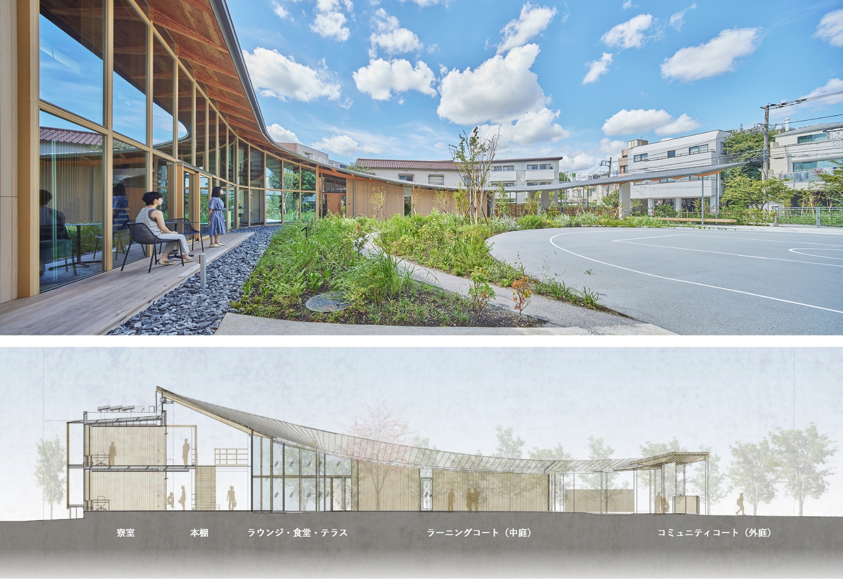 東京都練馬区の閑静な住宅街に建つ、竹中育英会学生寮の建替計画。広い敷地を最大限に活かし、個人での学習から地域との交流まで、多様な活動をゆるやかにつなぐ木質空間と、それを包み込む有機的な形状の屋根を計画した。庭の各所に生物多様性向上のための仕掛けを設置し、建築と自然の豊かな関係を生み出すことを目指した。高断熱外皮と高効率設備の実装によりZEH-M Readyの認証を取得、住環境を改善しながら心地よい居住空間を実現した。