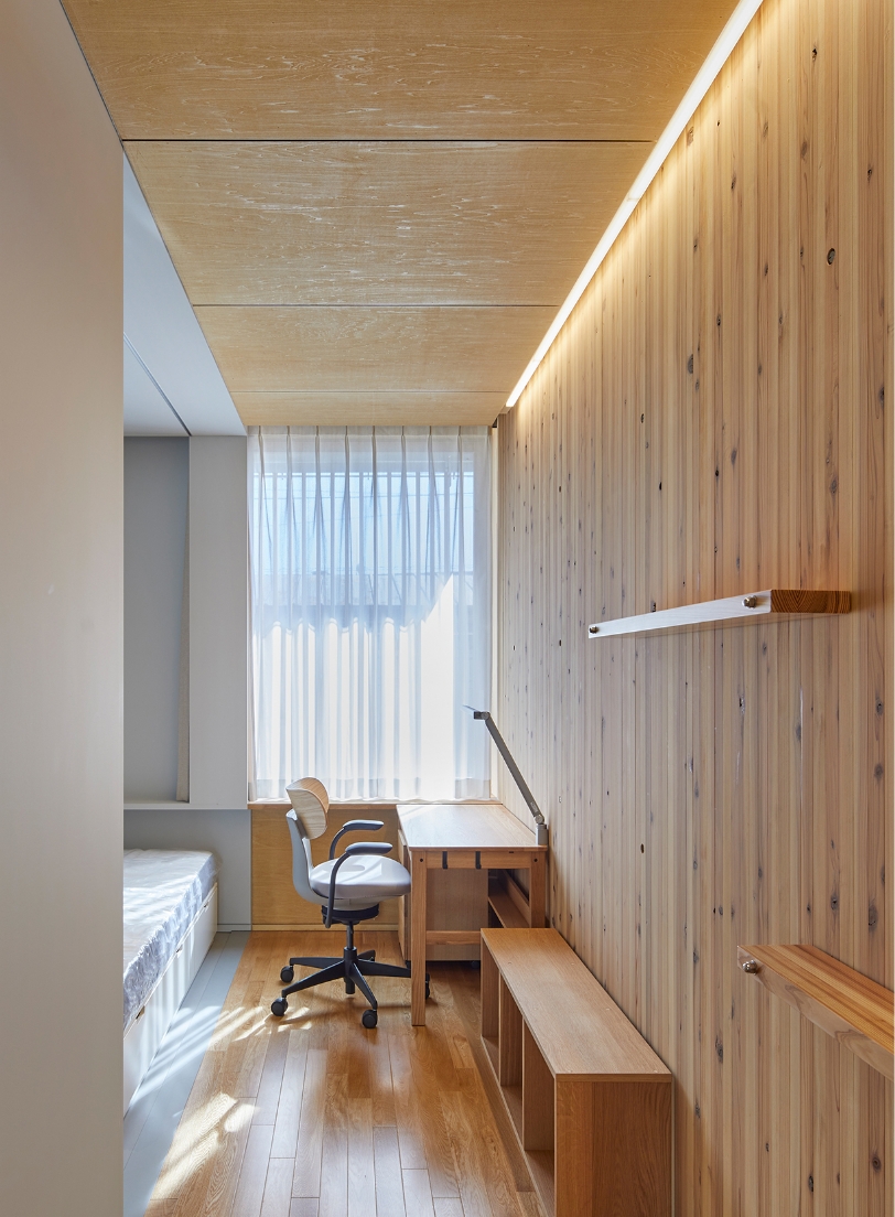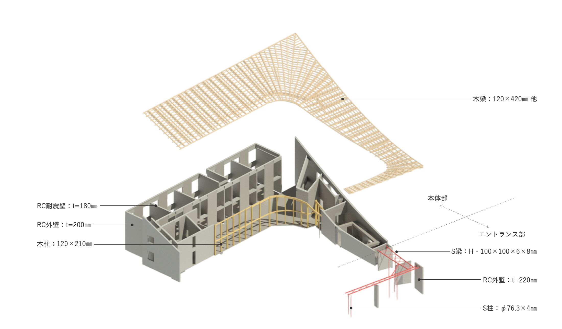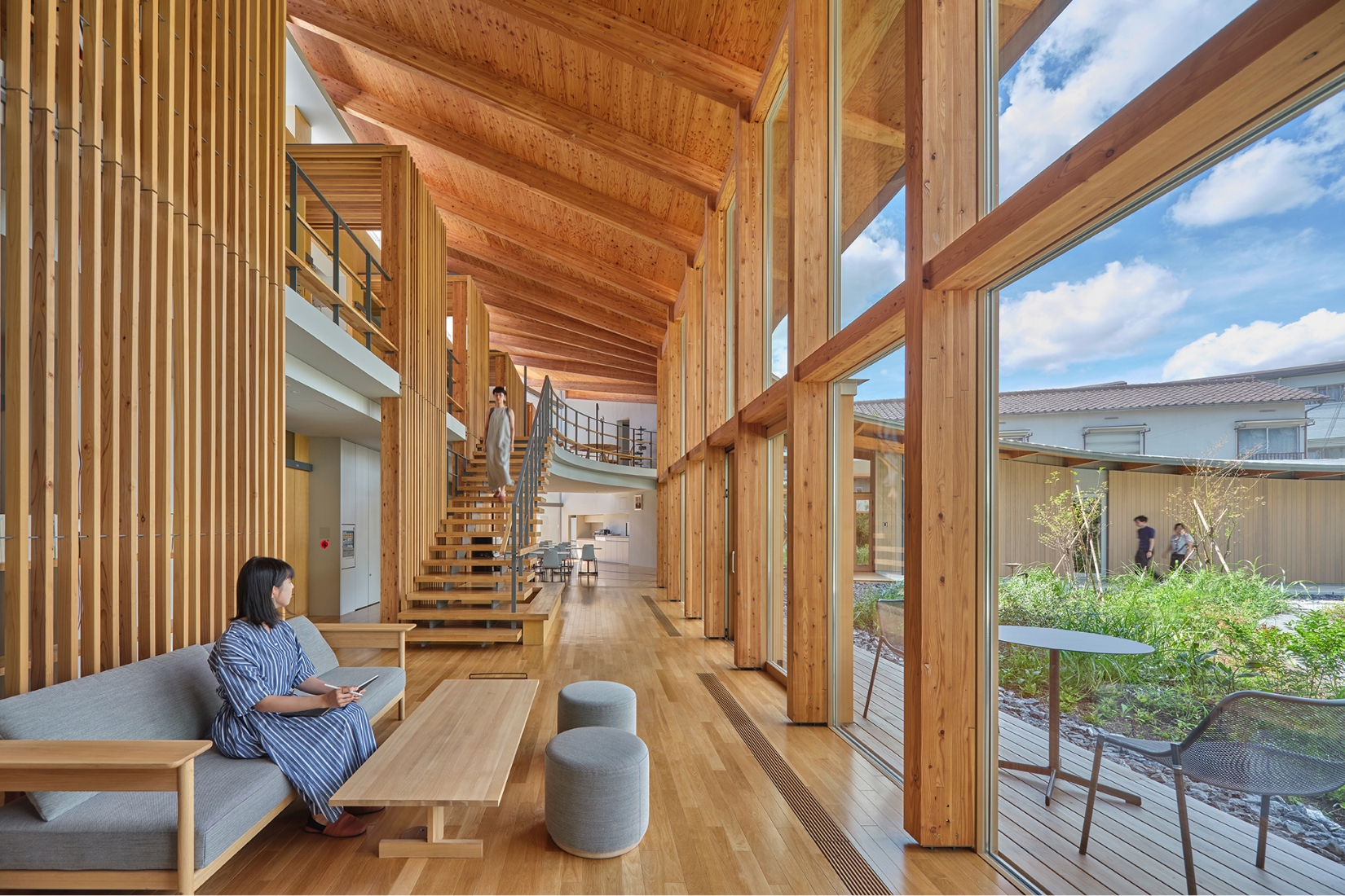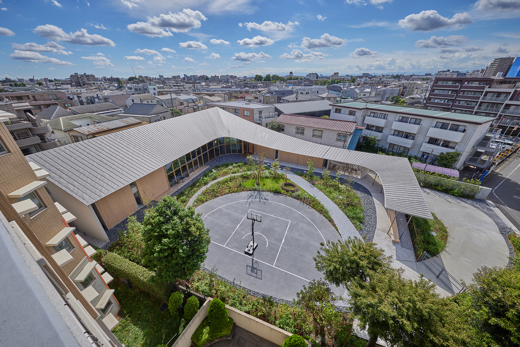 東京都練馬区の閑静な住宅街に建つ、竹中育英会学生寮の建替計画。広い敷地を最大限に活かし、個人での学習から地域との交流まで、多様な活動をゆるやかにつなぐ木質空間と、それを包み込む有機的な形状の屋根を計画した。庭の各所に生物多様性向上のための仕掛けを設置し、建築と自然の豊かな関係を生み出すことを目指した。高断熱外皮と高効率設備の実装によりZEH-M Readyの認証を取得、住環境を改善しながら心地よい居住空間を実現した。