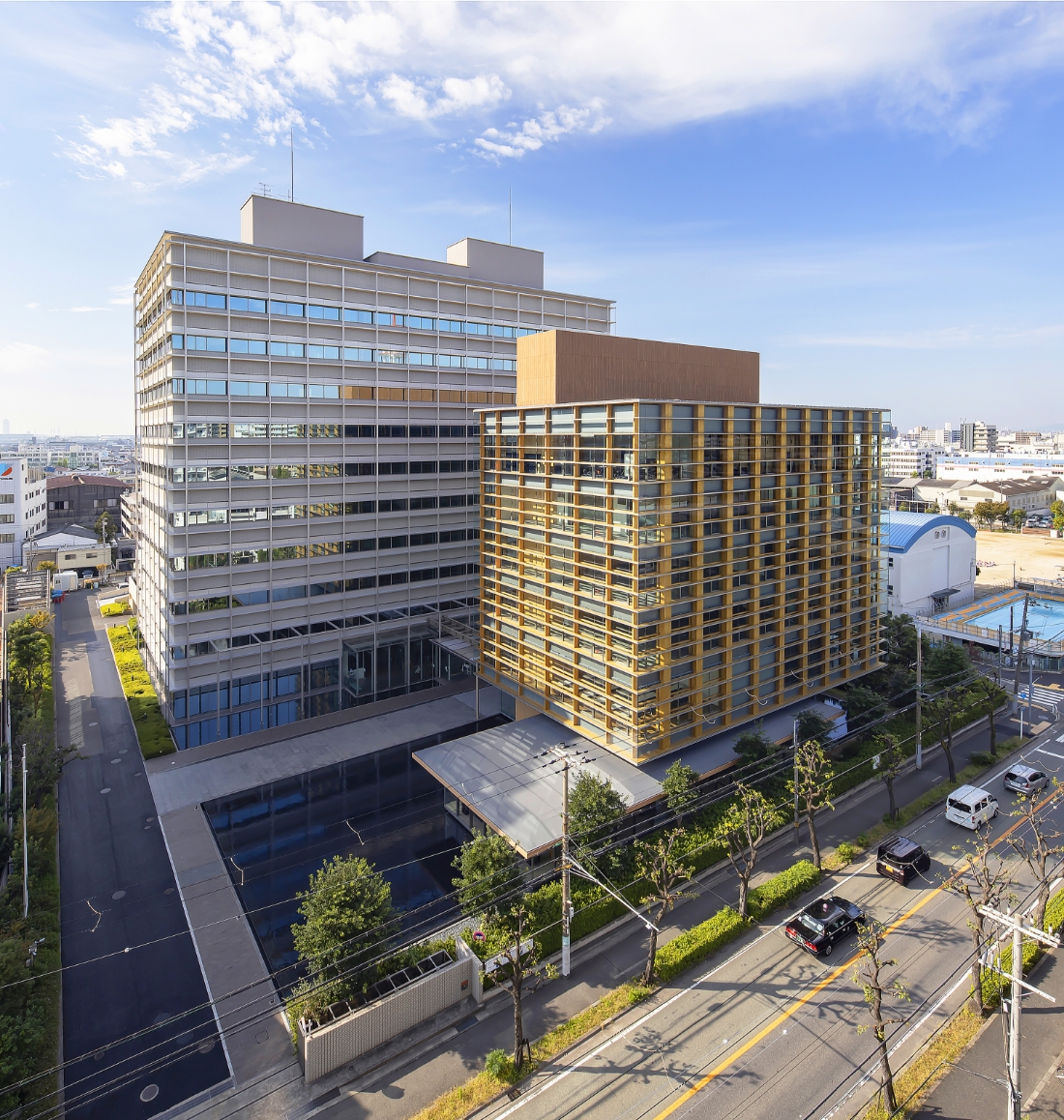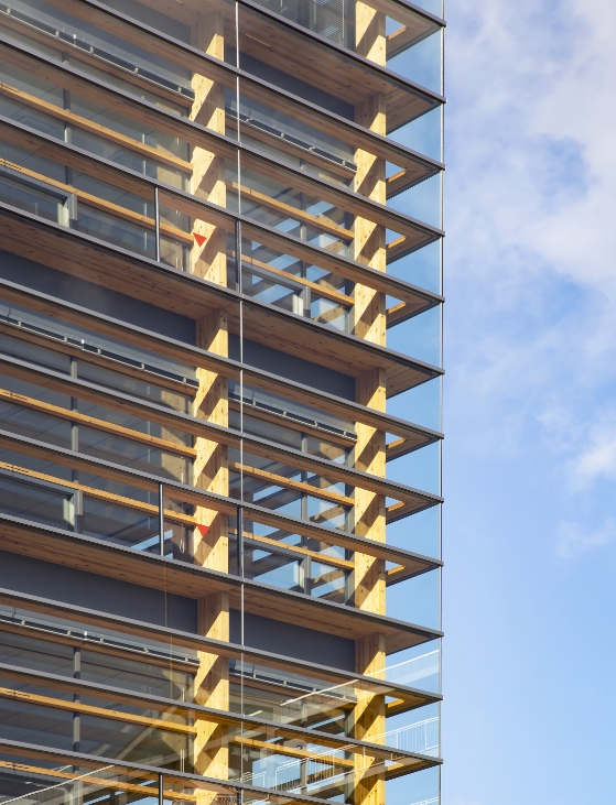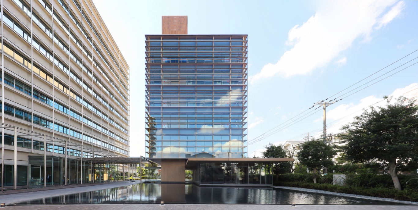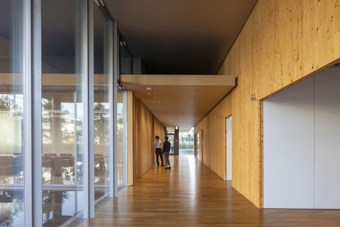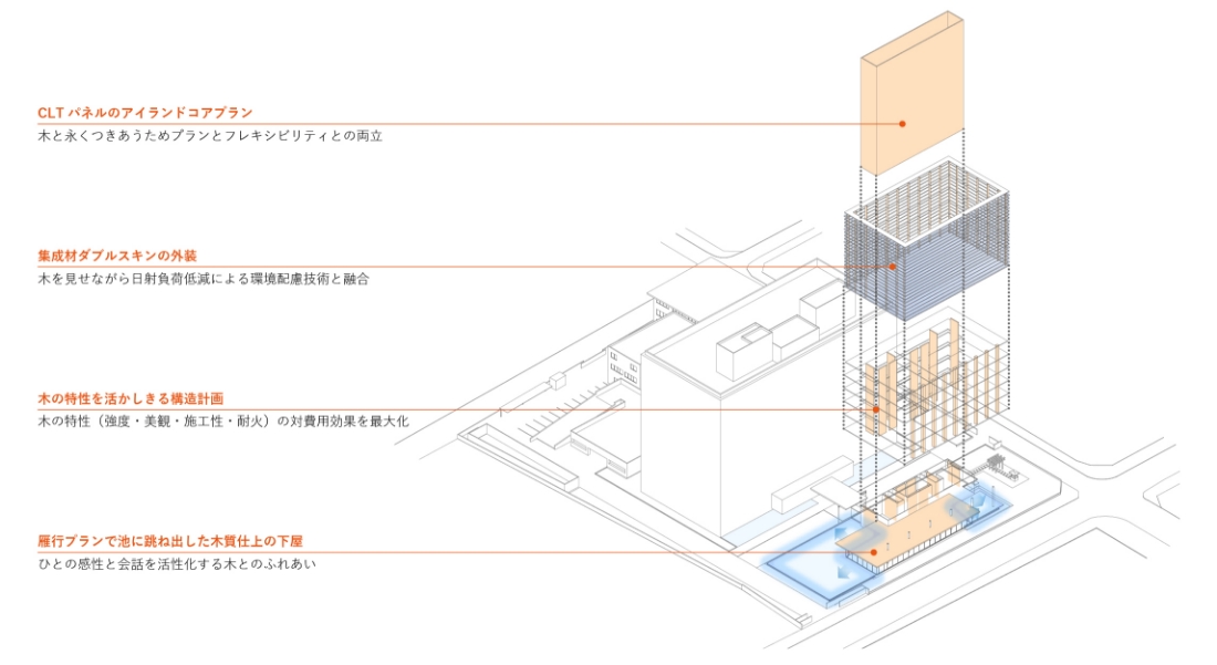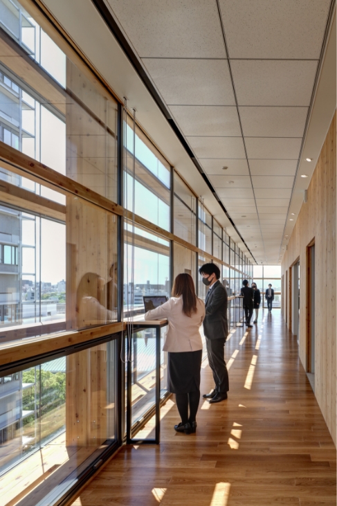ボイラー・プラントメーカーの本社研修・事務所である。建築主のバイオマスプラント事業は⽊材の循環に寄与する。こうした環境配慮事業を推進するという理念を体現する施設とすると同時に、都市における2時間耐⽕⽊造を、すべての⽊部を現しで実現した計画である。耐震要素にCLTパネル、柱に耐⽕集成材柱、基礎免震も採⽤し、鉄⾻造と⽊造のハイブリッド架構とした。CLTパネルで覆われたアイランドコアと⽊部が鮮明に外部に表出する集成材ダブルスキンの外装は、内外における⽊質感を強調。それとともに、既存本館との視覚的なつながりやプラン上のフレキシビリティにも寄与している。