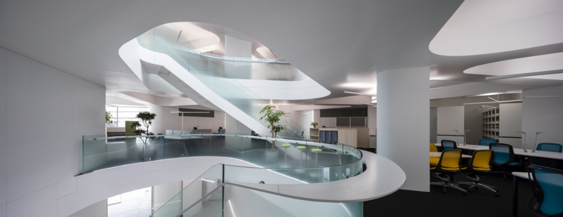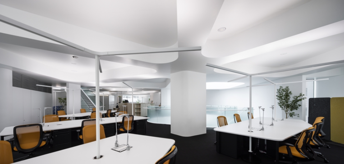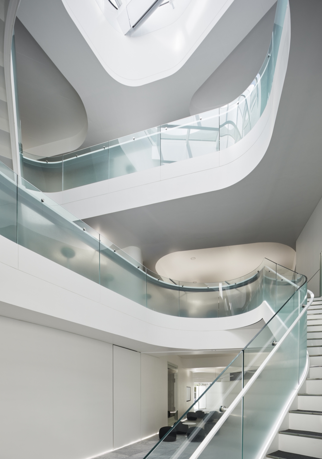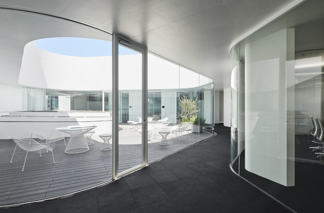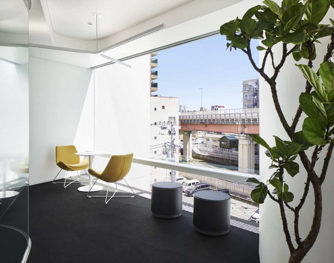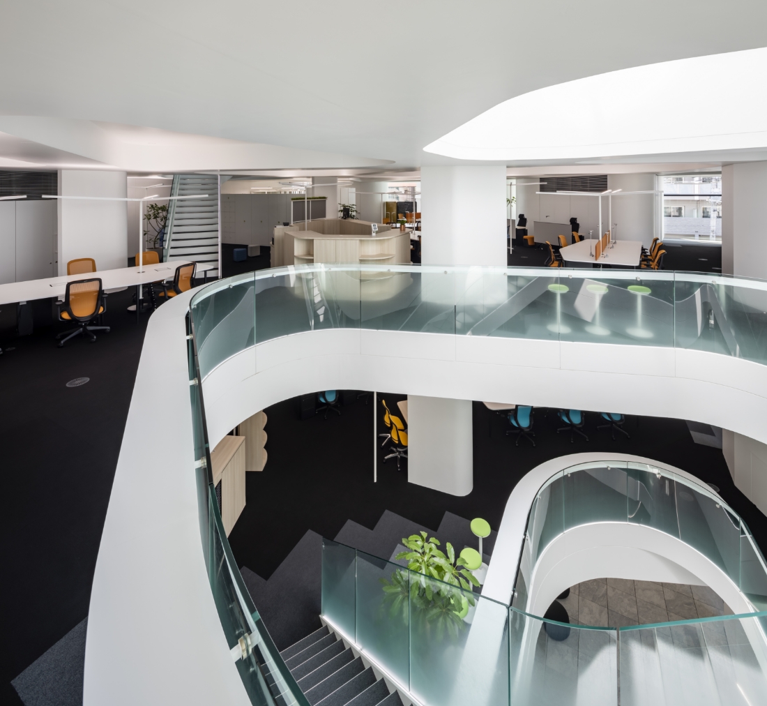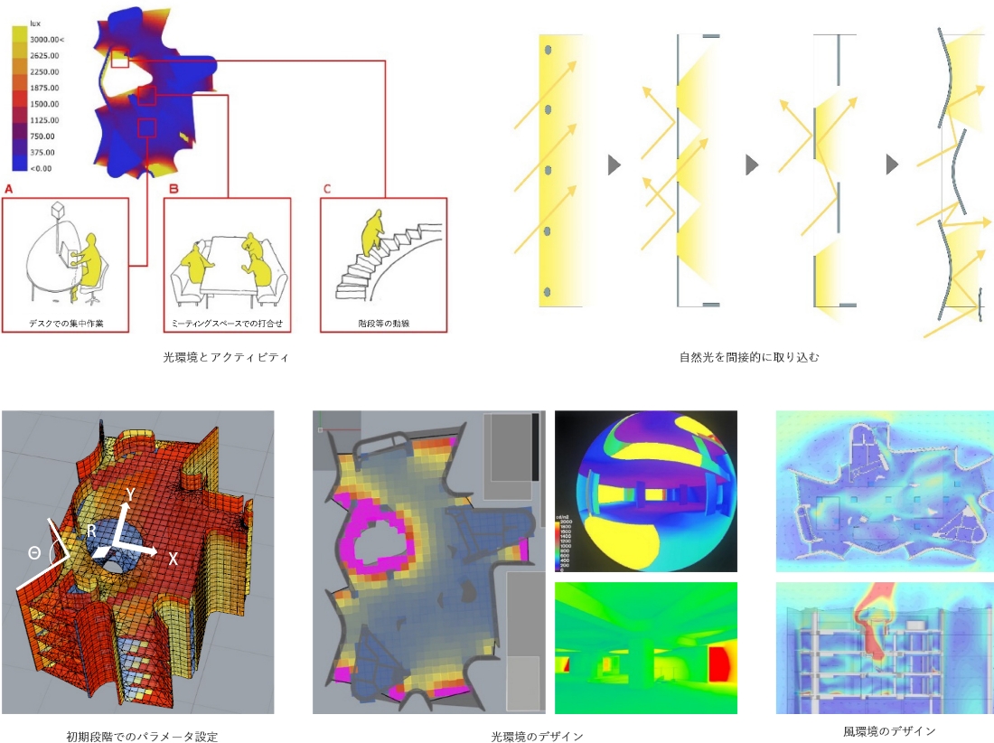 リサイクルを中⼼としたグループ会社を統括する持株会社の中規模オフィスビルである。光や⾵など、都市に潜む⾃然環境に呼応することで、都⼼においても⼈と⾃然をつなぐことを⽬指した。緩やかに繋がる有機的な空間に、適度に緩和された⾃然光とそよ⾵を取り込んでいる。建物の中央の吹抜けや外壁の形状は、シミュレーションを重ねることで、場所毎のアクティビティ(デスクワーク・ミーティング・移動)に適した光環境になるようチューニングした。室内の仕上げを極⼒なくし、コンクリートの躯体をそのまま⽣かして内外の印象を近づけ、室内にいながら屋外の環境の変化を楽しむことができるワークプレイスとしている。