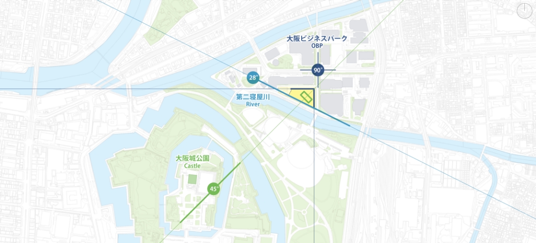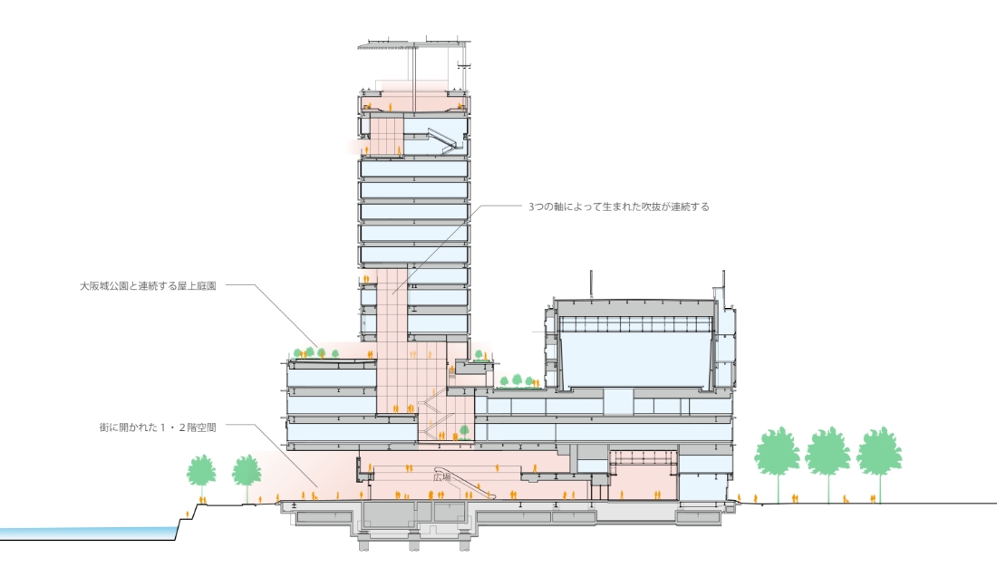 街に開かれたテレビ局を目指し、1・2階には来街者が自由に立ち寄れる屋外ピロティと円形ロビーを設けている。放送局機能は3階以上に配置し、低層部では街区と川が持つ2軸に合わせて最大平面を確保、高層部を街区から45度振れた軸上に配して大阪城に正対させた。低層部から高層部へ軸の切り替わる場所には屋上庭園を設けて、大阪城公園の広大な緑地と視覚的に繋げている。内部は、外周に必要諸室を配置して中央を吹き抜けとし、ガラス天井を介してエントランスロビーに繋げることで、コミュニケーションを誘発する新社屋の幹となることを意図した。