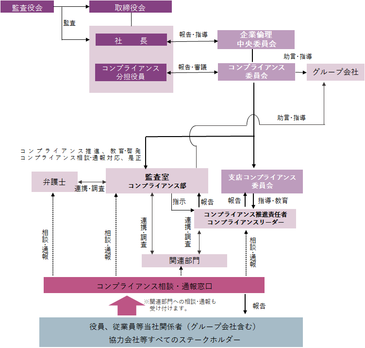 コンプライアンスを徹底・推進させる体制として、企業倫理中央委員会の下にコンプライアンス委員会を設置し、重要リスクを特定し活動方針を定め推進状況を確認するとともに、個別事案の対応状況を確認し改善策を指示しています。さらに支店委員会でその方針及び施策を展開するとともに、各事業所に推進役を配置しています。