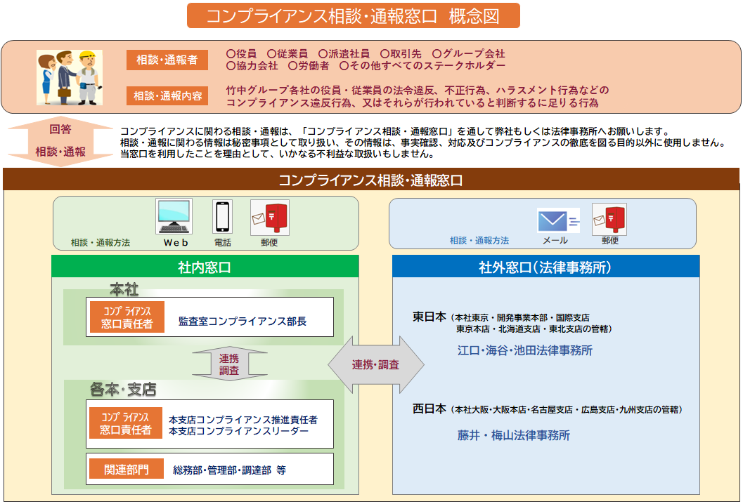 竹中グループの事業に関わる全てのステークホルダーが、竹中グループ各社での法令違反、不正行為、ハラスメント行為などのコンプライアンス違反を発見した場合 又はそれら が行われていると判断するに足る理由がある場合に、当該事象を相談・通報できる体制を整備しております。