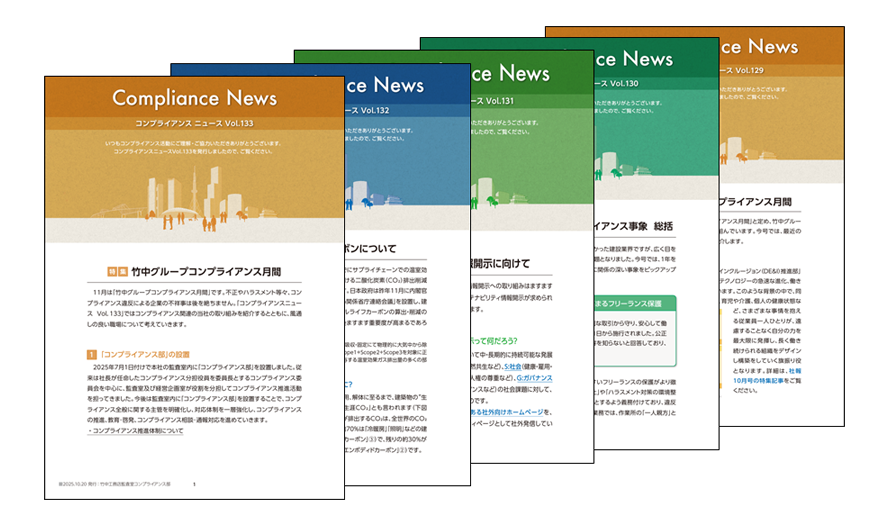 竹中グループ全従業員に向けて「CSR・コンプライアンスニュース」を5回/年を目途に発行しています。VOL.129(2024年10月23日発刊)においては、7月に新たに設置されたDE&I(ダイバーシティ・エクイティ&インクルージョン)推進部の役割や、CSR・コンプライアンス月間のグループ討議のテーマとした、「心理的安全性」について紹介し、人権意識の向上に努めています。