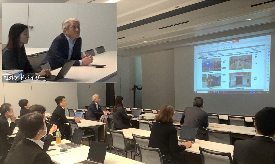 2024年は、サステナビリティ情報開示を視野に入れ、新たにKPMGあずさ監査法人のアドバイザーを迎えて、人権活動に関するレビューを東京本店で開催しました。当社からは、3部署から4つの課題について、本年の活動を報告しました。人事室からは2024年4月より建設業界にも適用された「時間外上限規制」を遵守するための勤怠管理システムの改善や管理の徹底、規制内容理解の浸透、時間外勤務時間の実態などを、生産本部からは同課題に対する業務効率向上に有効な取り組みの展開状況や、時間外勤務時間や作業所閉所の状況などについて報告しました。次いで、人事室からハランスメント防止に向けた各階層への研修やeラーニングなどの教育・啓蒙活動の実績について報告しました。調達本部からは、昨年に引き続いて海外サプライヤーに対して、1次会社とともに2次会社を訪問しての工場労働の実態調査や、外国人労働者を雇用している国内協力会社を直接訪問しての実態調査、さらには現業の定常活動になった各本支店での協力会社訪問調査の状況報告を行いました。