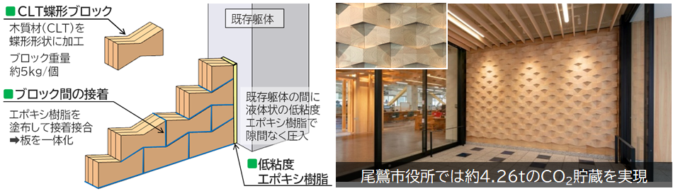 脱炭素社会の実現に向けた森林資源の有効活用の一環として、木質材である直交集成板(CLT)を用いた蝶形ブロックを接着しながら積層し、耐震壁を構築する耐震補強工法を開発し尾鷲市役所ほかプロジェクトに適用しました。
