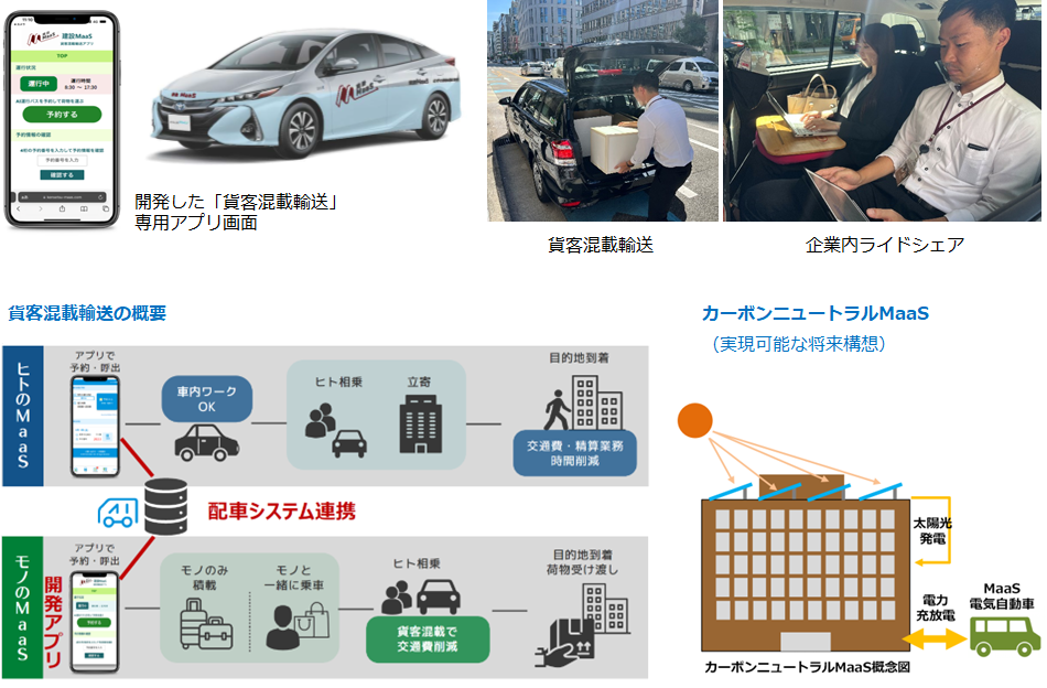 シェア社有車でオンデマンド移動・搬送を行う、建設MaaS®( MaaS、マースとは Mobility as a Serviceの略で、スマホアプリで移動のサービスを利用者に提供する考え方です)による搬送の効率化を図り、働き方改革や脱炭素への貢献にチャレンジしました。