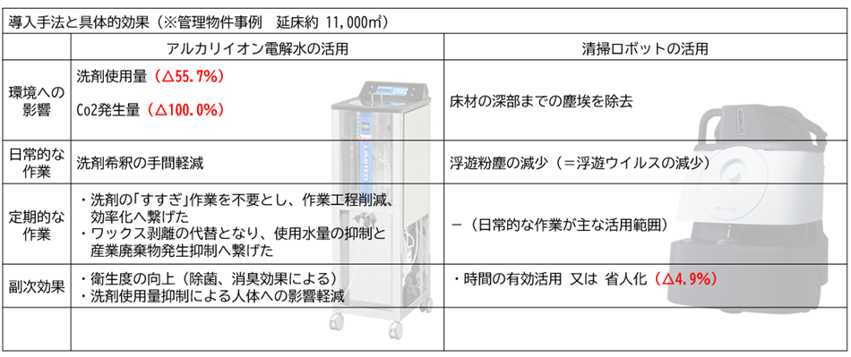 管理している建物の床の清掃で、汚水の発生やCO2の排出など環境面に配慮した、先進的メンテナンス手法を用いることで環境負荷の軽減や抑制を実現し、コスト面及び作業人員の有効活用に取組みました。