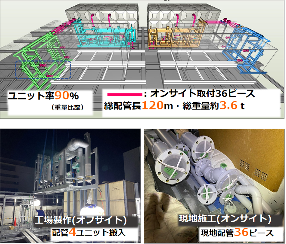 名古屋センタービル本館CLIS更新工事で、3Dスキャナーを使用したDXを活用し、オフサイト(工場)にて、90%を保温・板金加工まで行った配管ユニットとしました。オンサイト(現場)作業工数を40%削減、工期を短縮し、CO2排出量を削減しました