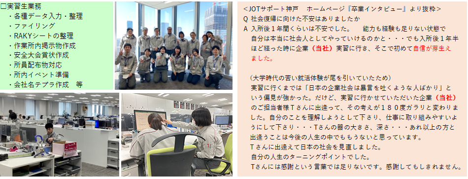 就労移行支援事業所(JOTサポート神戸)からの、対人関係に不安を抱え、コミュニケーションが苦手な発達障がい等を抱えた実習生に、事務補助業務など社会経験をしてもらいました。