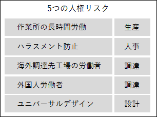 2018年に外部有識者を交えて「人権デューディリジェンス」を実施し、人権尊重に関して5つの人権リスクを特定・評価しました。そのうち、調達分野では「海外調達先工場の労働者(児童労働・地域住民への影響など)」及び「国内で就労する外国人労働者(技能実習生・特定技能など)」の2つの人権リスクを特定しました。