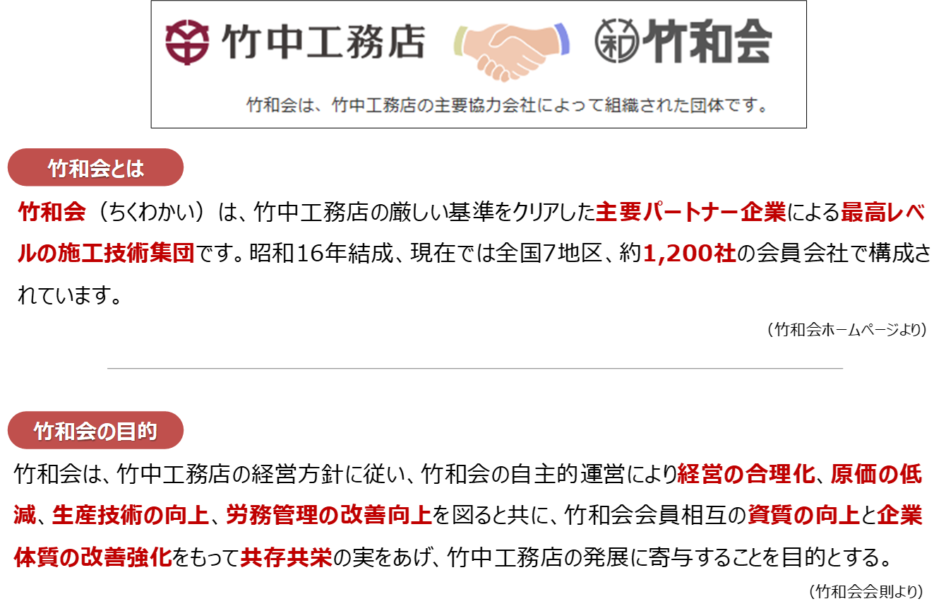 竹和会(ちくわかい)は、竹中工務店の厳しい基準をクリアした主要パートナー企業による最高レベルの施工技術集団です。1941年に結成され、現在では全国7地区、1,200社以上の会員会社で構成されています。