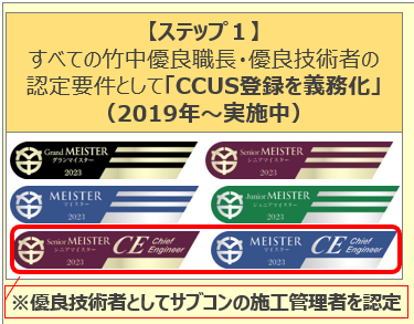 当社は、2017年より協力会社の主任技術者や工事技術者等を対象に「竹中優良技術者制度」を導入しています。認定資格には「シニアマイスターCE*」と「マイスターCE」があります。 *CE:Chief Engineer