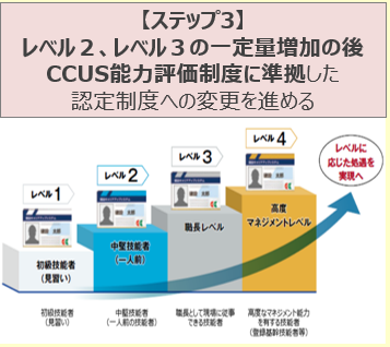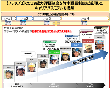 「建設キャリアアップシステム(CCUS)」は、技能者の資格や現場での就業履歴等を登録・蓄積し、技能者の処遇につなげる仕組みで、業界団体と国が連携し官民一体で普及を推進しています。当社では技能労働者のキャリアパスモデル構築や処遇改善にもCCUSを活用しています。