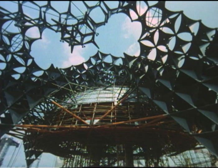 冒頭のお祭り広場は当時、世界最大級の幅108m、長さ291.6m、使用鉄骨4,800tの大屋根をリフトアップで施工した一大プロジェクトです。そしてその大屋根を突き抜けていたのが岡本太郎作の太陽の塔。引き続き紹介されるのは万博会場のパビリオンの中で最初にリフトアップ施工された「電力館」。4本の直径2.2mのパイプから吊るされた空中アトリウムが現れました。次に1,444個の四面体テトラから構成された「怪獣」とも称された東芝IHI館。その施工に意見をぶつけ合う竹中工務店社内の白熱した討論の様子が当時の技術者の情熱をリアルに伝えています。