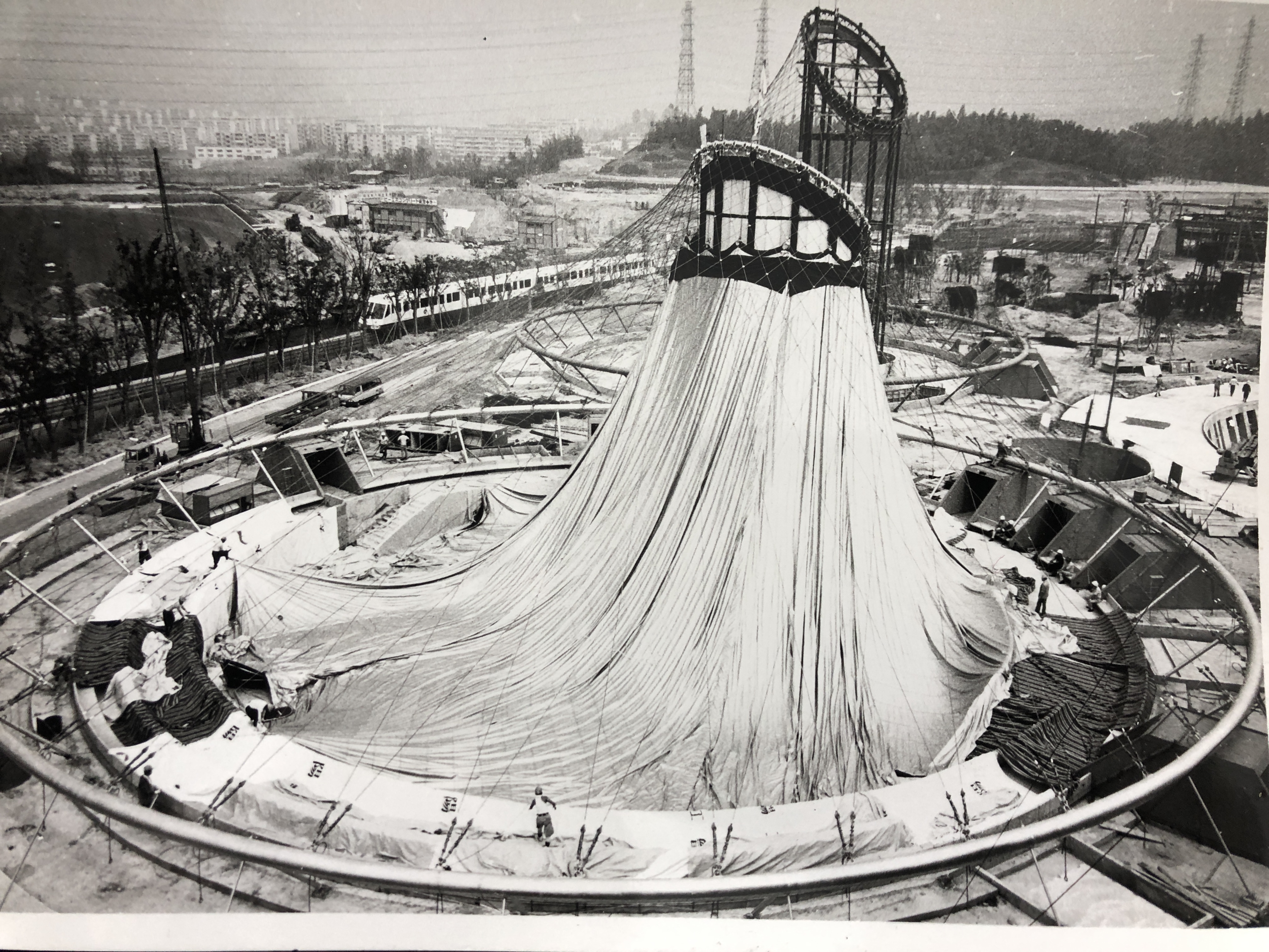 そしてワイヤーケーブルで補強されたテント構造の自動車館の建設施工ではダイナミックな空間創造の過程が映し出されます。