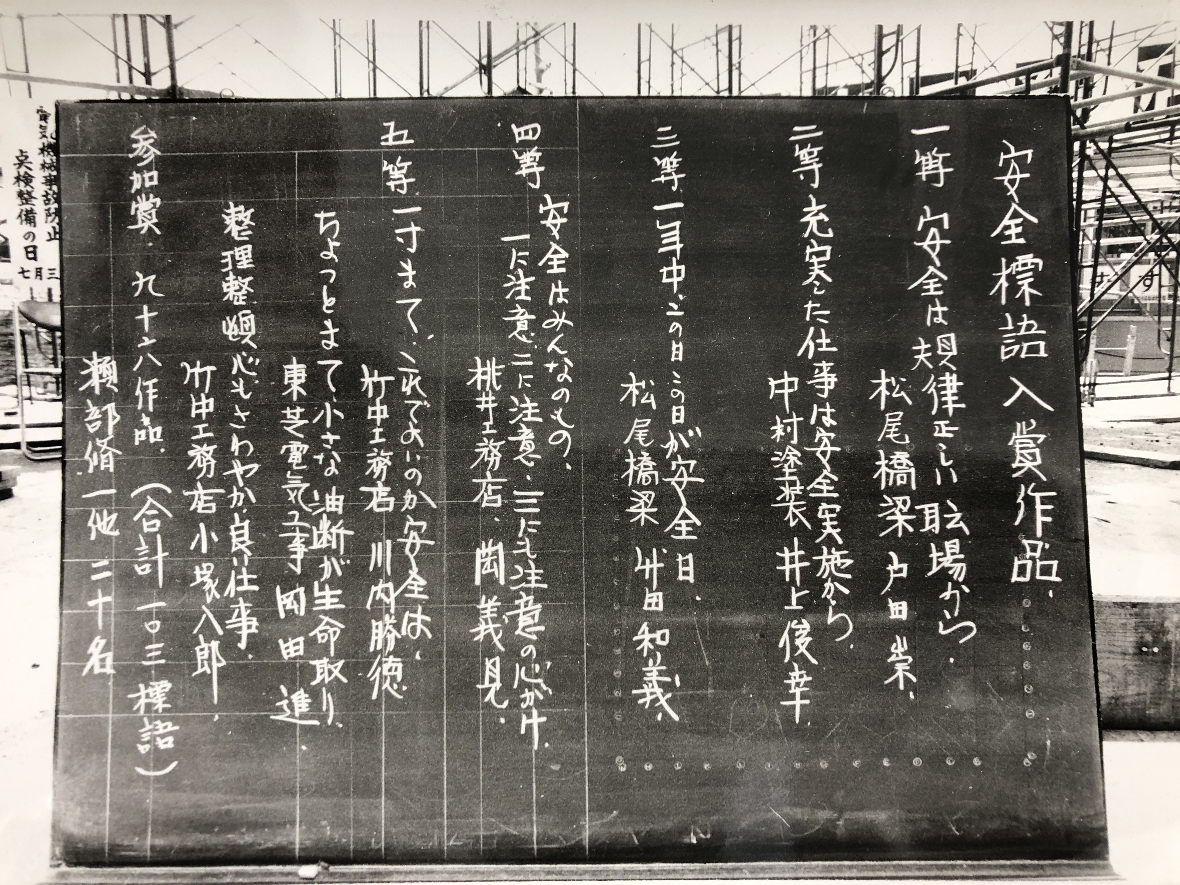 いかがでしたでしょうか。パビリオンの多様さも印象深いですが、ここで少し、話題を変えてそれを実現した建設技術者・技能者にも思いを馳せたいと思います。例えば安全管理。全ての作業に優先すべき安全管理に関して東芝IHI館作業所での写真が見つかりました。それは7月のある一日、関係者が一同に介した安全標語表彰の様子です。優秀賞受賞者名を呼ぶ所長と思われる方の肉声が聞こえてくるようなシーンです。