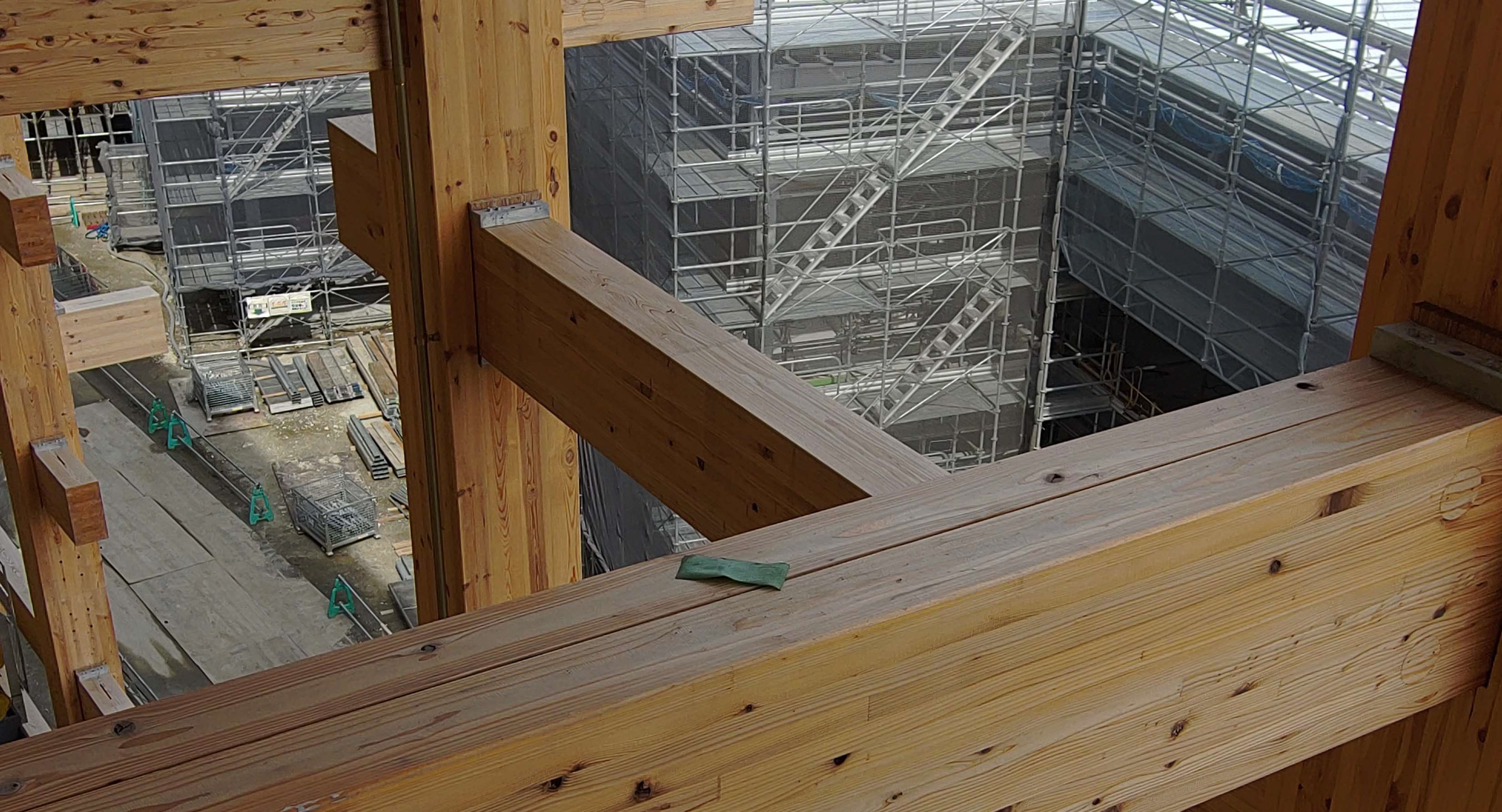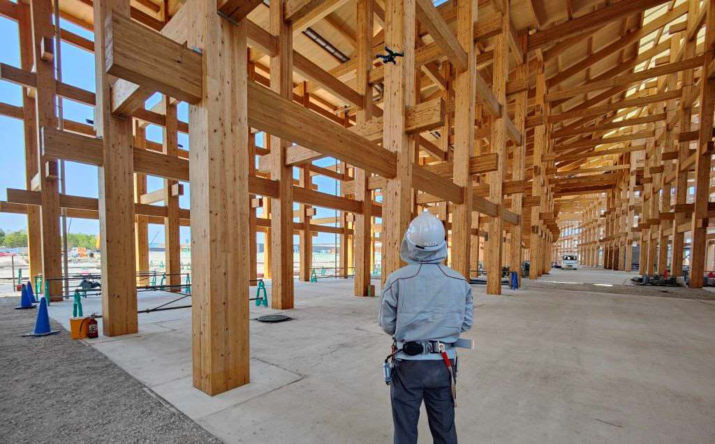 世界最大級の木造建築となる「大屋根リング」での上層部での残置物やボルトの閉め忘れなどを点検し、高所作業車による最終点検の効率化をはかる取り組みを行っています。