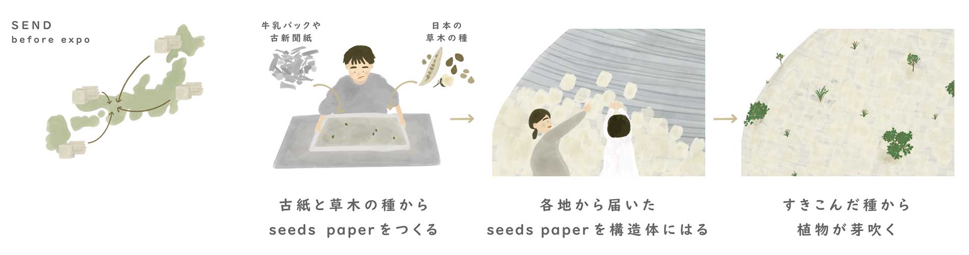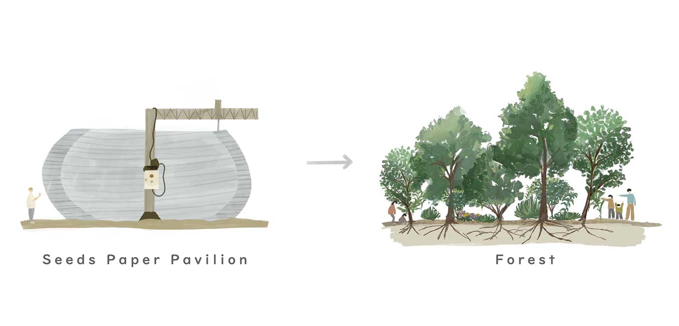 パビリオンの構造材は生分解可能な素材を使って3Dプリントし、仕上げ材は、手づくりの和紙に日本の草木の種をすきこんだ「Seeds Paper」を使用します。