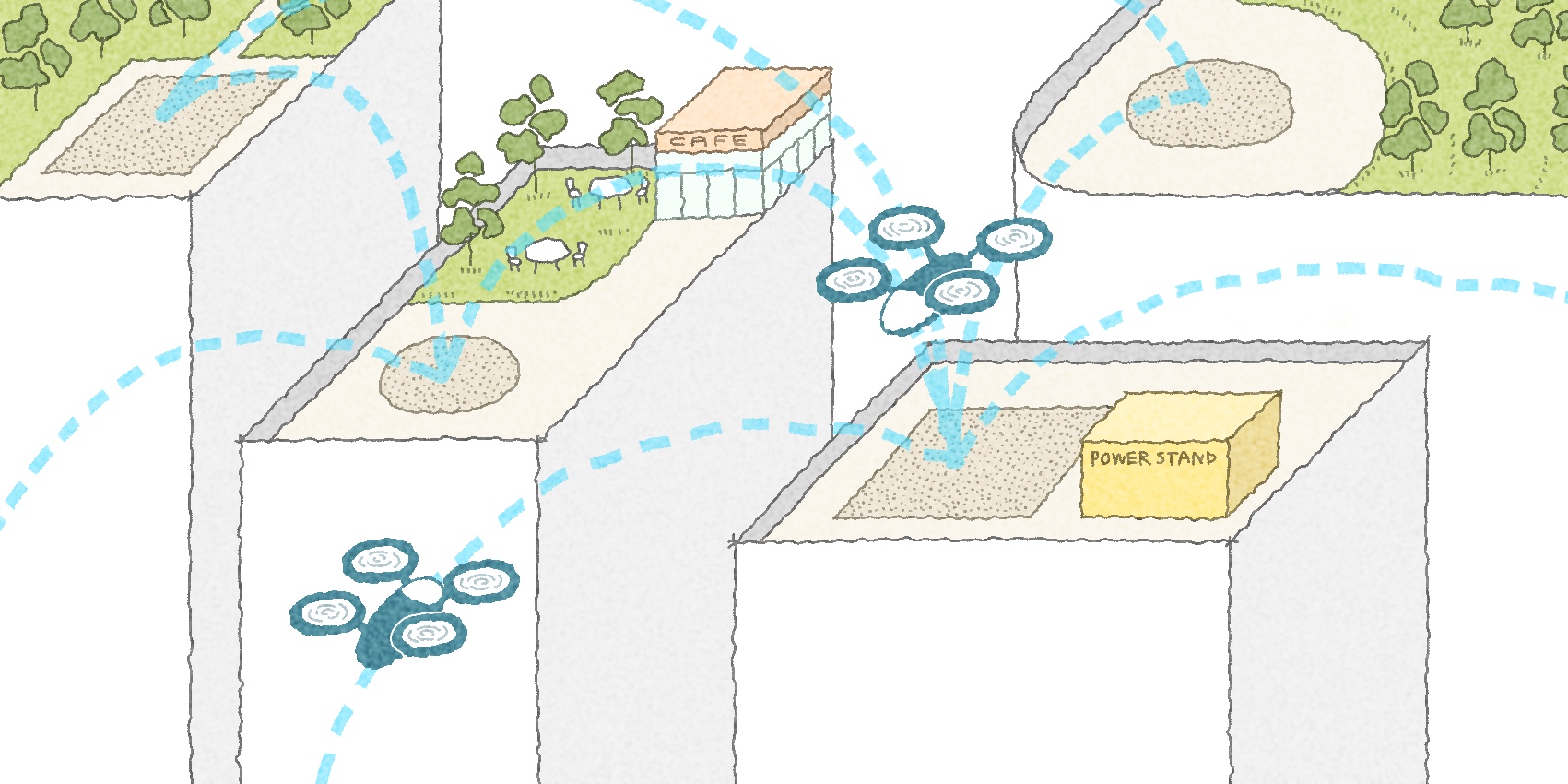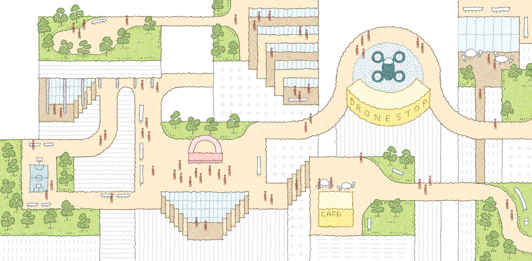 ① ドローンや空中インフラの発達によって、ドローンの発着場や、それに伴う公園、店舗などが計画されます。屋上の価値が向上し、人々が集う豊かな居場所となります。