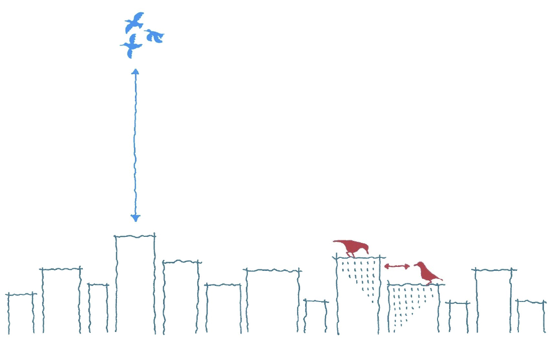 大地から離れ、地上と空を行き来する鳥の視点で、そんなミライの都市を覗いてみましょう。その視点場は地上や空中といった領域を横断するだけでなく、実践と計画、現代と未来をつなぐ思考をもたらすのではないでしょうか。