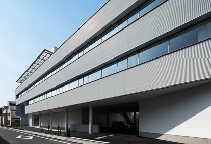 町工場の並ぶ立地に建つ厨房機器メーカーの本社ビルです。周辺に配慮して低層建物としました。外装は彫の深い横連窓とし、間口の広さを活かした水平に広がる意匠としました。内部は社内コミュニケーションを活性化させる事を意図し、三層の事務室を開放的な階段室で繋ぎ一体化させました。